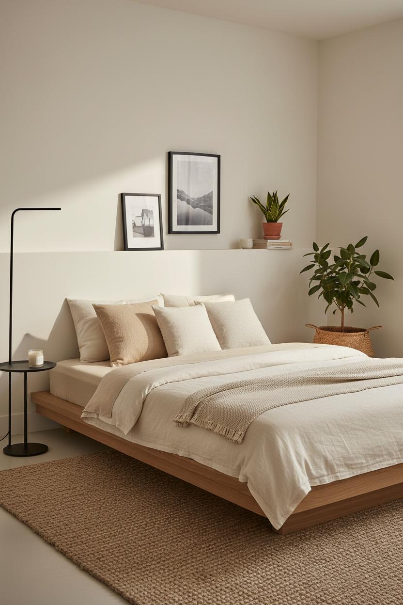 Think of art and decor as the jewelry of your minimalist bedroom—purposeful pieces that tell your story without crowding the room. Thrift stores and flea markets are gold mines for frames, simple lamps, and small ceramic vessels that feel collected and calm. Don’t worry about mismatched finishes; unify everything with a quick coat of matte black or soft white spray paint, or swap in linen mats for an elevated look. Let your palette flow from the textiles already on your bed: a stone-colored linen duvet cover and a crisp bamboo sheet set create an effortless base to pull hues from. Add quiet texture with a flat-weave jute area rug and keep your profile low with a simple platform bed frame to make the space feel open and airy. These choices instantly read as affordable home decor that still feels luxe.
