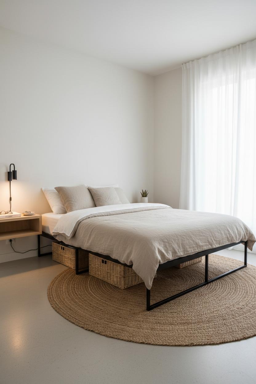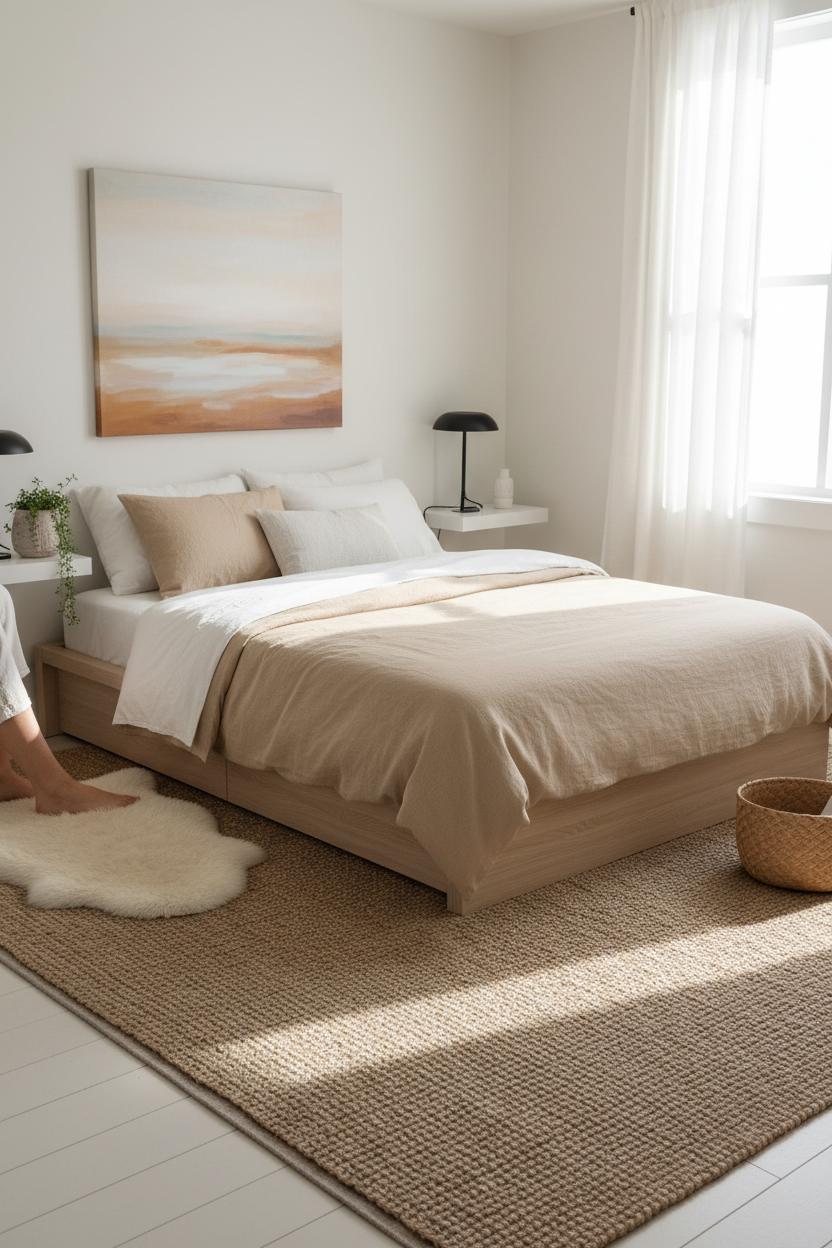 Keep the bedding serene and touchable so the bed becomes a soothing focal point. A stone or oatmeal linen duvet cover brings that relaxed, slightly rumpled texture you see in all the dreamy pins, while a bamboo sheet set feels cool and breathable against the skin. Stay within a soft, neutral palette to allow the silhouette of the platform bed frame to shine; the restraint is what makes budget bedroom decor look elevated. Ground the vignette with a jute area rug that peeks out a few inches on each side—it adds warmth underfoot and a natural weave that complements minimalist decor without shouting for attention. If you’re tight on floor space, swap bulky nightstands for floating wall shelves and mount a slender sconce above; it keeps pathways clear and gives you just enough room for a book, glasses, and a small dish for jewelry.