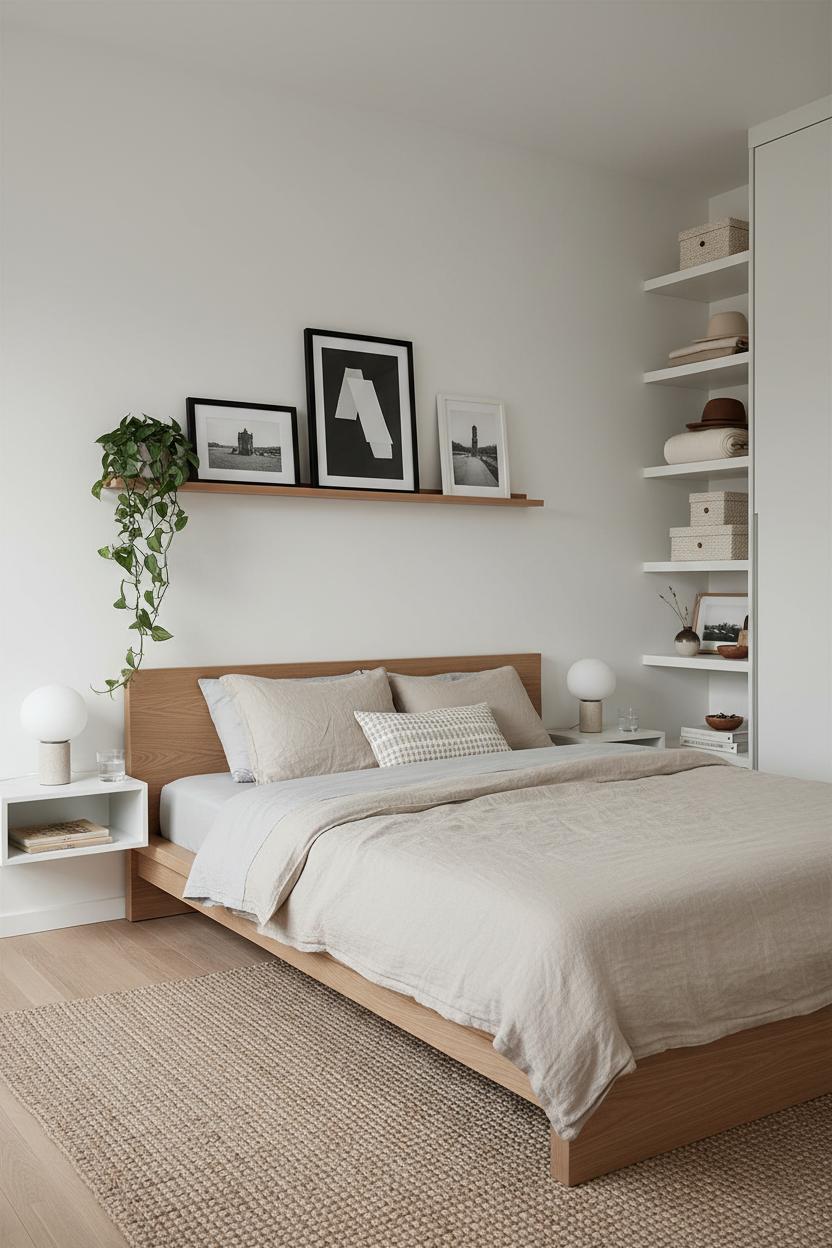 If you’re working with budget bedroom decor, paint is your best friend: one gallon of a warm, not-too-bright white can unify mismatched furniture and trim in a weekend. Keep metals minimal and consistent—brushed brass with warm neutrals, or black with cooler grays—so your accents feel intentional. For art, go with black-and-white photography or simple line drawings; even thrifted frames look chic when they share a color family. Floating wall shelves painted the same shade as your walls disappear visually while still giving you space to style a candle, a small stack of books, or a tiny plant. Think of green as a “neutral” too—one or two leafy moments will soften all the clean lines and bring your minimalist decor to life.