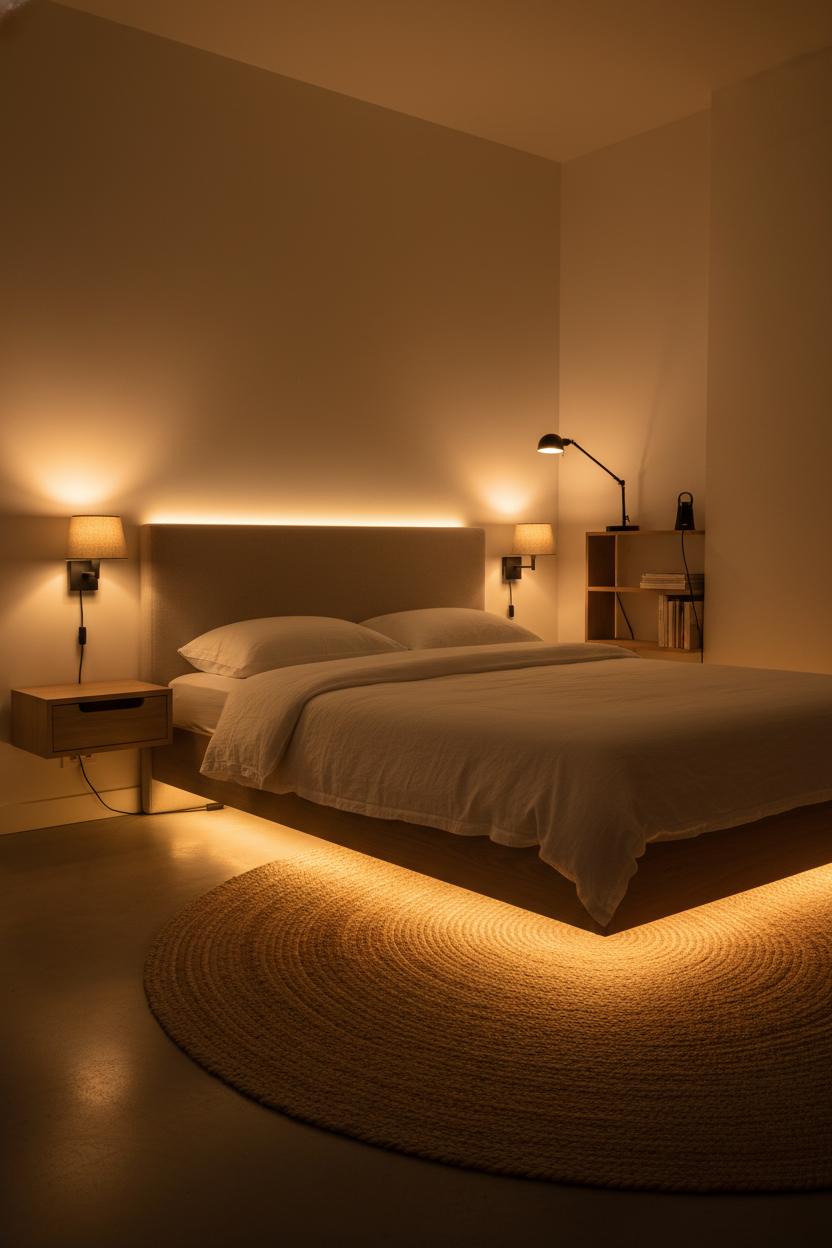 Layering is everything, especially for small bedroom ideas where square footage is precious. Try a plug-in wall sconce above each nightstand to free up surface space, or clip-on lamps for a rental-friendly fix. Tuck a thin LED strip behind the headboard or along the back edge of floating wall shelves for a halo effect that feels custom but costs little. A strip under a platform bed frame makes it look like it’s floating—set it to 10–20% brightness for a gentle path light on sleepy nights. This kind of minimalist decor keeps the room calm and high-impact without visual clutter.