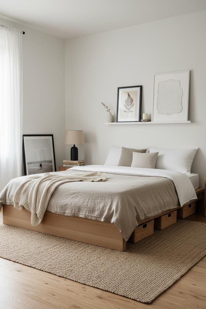 Finish with tactile accents you’ll actually use: a stack of well-loved books, a stone dish for jewelry, woven baskets to slide under the platform bed frame, and a soft throw at the foot of the bed. Keep to three materials you repeat—linen, wood, ceramic—and two metals at most. This simple formula keeps everything cohesive and is one of my favorite small bedroom ideas for stretching a budget. When you curate slowly and shop secondhand first, every detail feels intentional, personal, and serene—proof that affordable home decor can look beautifully minimalist without ever feeling sparse.