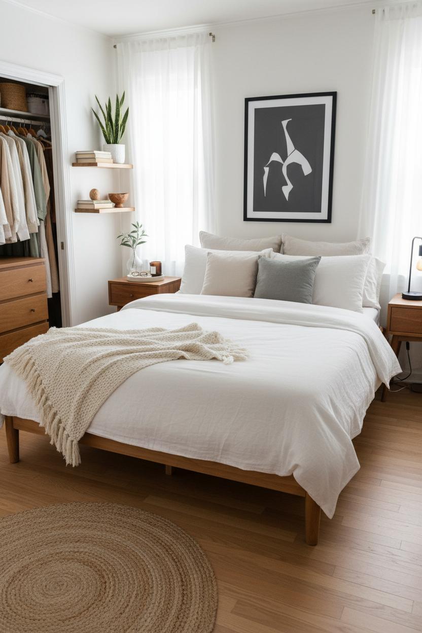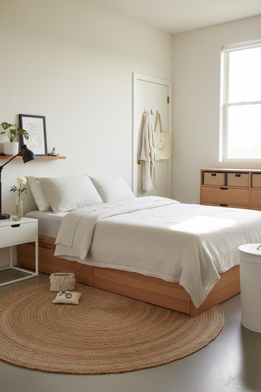 Finally, reset your surfaces. Keep nightstands 70% clear and corral daily essentials on a small tray. Use vertical space thoughtfully—floating wall shelves can replace a bulky bookcase, but style them sparingly and stop when they look half full. If the room needs softness after the edit, ground it with a simple jute area rug; it adds warmth and texture while keeping lines clean, a perfect piece of affordable home decor. Decluttering first means every item you do add—maybe a thrifted lamp or breezy white curtains—reads intentional rather than “extra.” It’s the foundation of a minimalist bedroom on any budget, and it gives you clarity about what to save for next and what you can happily live without, turning even the tiniest nook into a calm, streamlined retreat rich with small bedroom ideas.