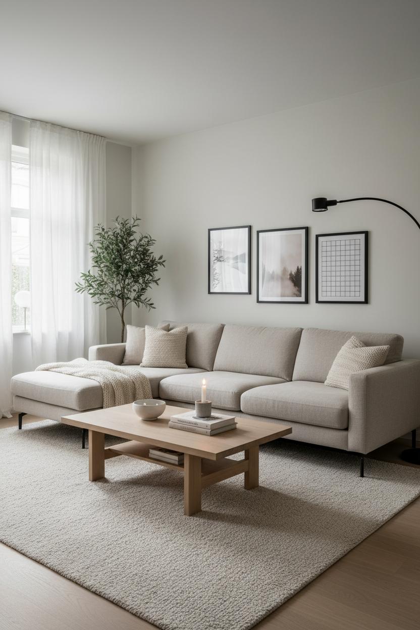 For seating, choose a modern sofa with relaxed tailoring in a natural fabric; if you love to lounge, a linen sectional sofa reads airy yet substantial, especially when it’s lifted on legs to keep sightlines open for small space design. Ground the room with a neutral area rug in a wool blend or textured flatweave—tone-on-tone variations add interest while staying soothing. Anchor with an oak coffee table that brings in that honeyed wood warmth; rounded edges feel softer and are circulation-friendly in compact rooms. Layer pillows in sandy stripes, quiet checks, or a faint herringbone, then add a linen throw to echo the upholstery for a pulled-together look. Limit the palette to three or four core tones and repeat them throughout for an effortless, curated vibe. Keep shelves edited—stacks of cream books, a single stone bowl, a small ceramic vase—so negative space has room to breathe. The result is a calm, lived-in sanctuary where every element earns its keep, and your minimalist living room feels both intentional and inviting, the kind of scandinavian decor you save to your board and actually recreate at home.