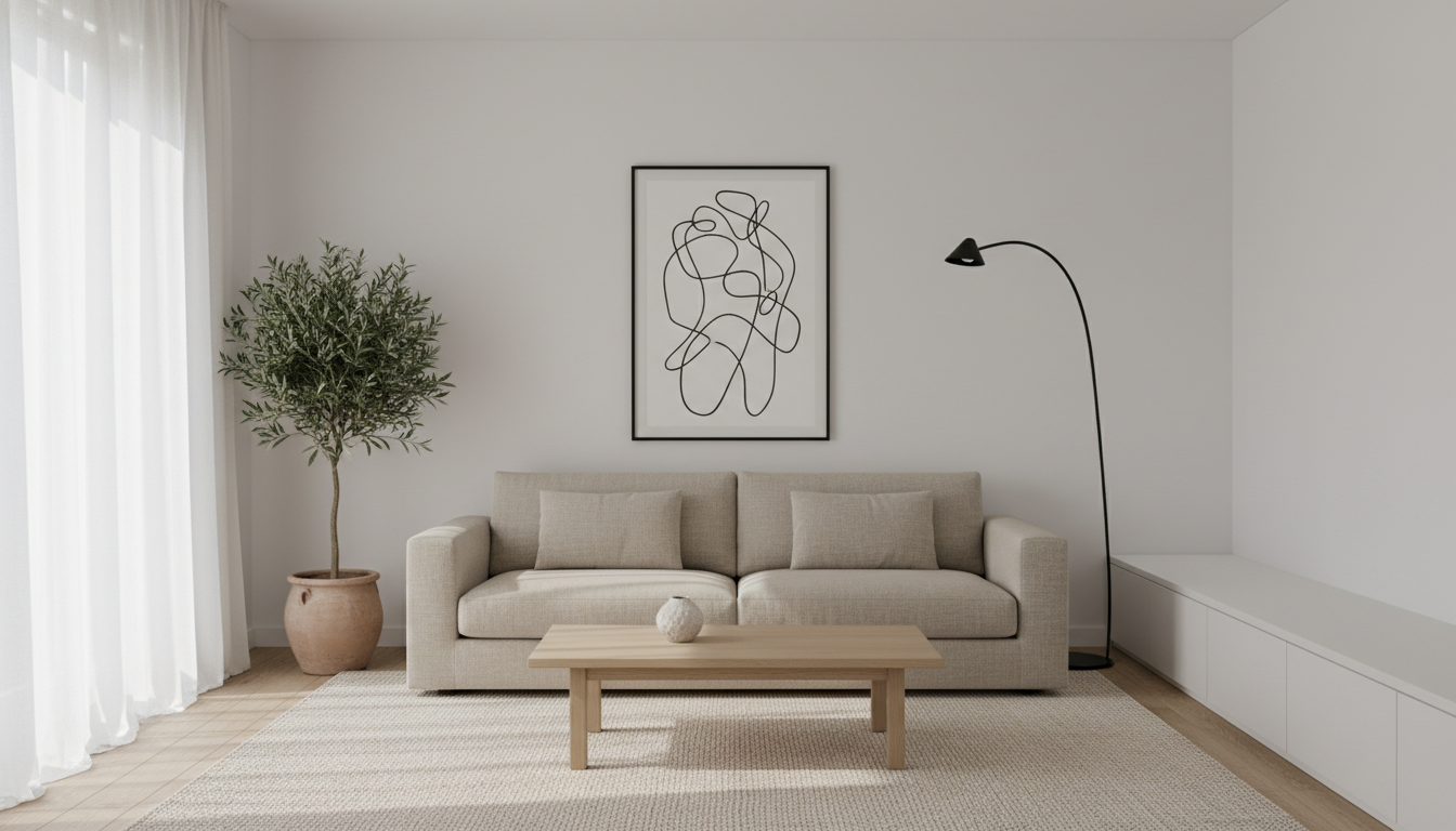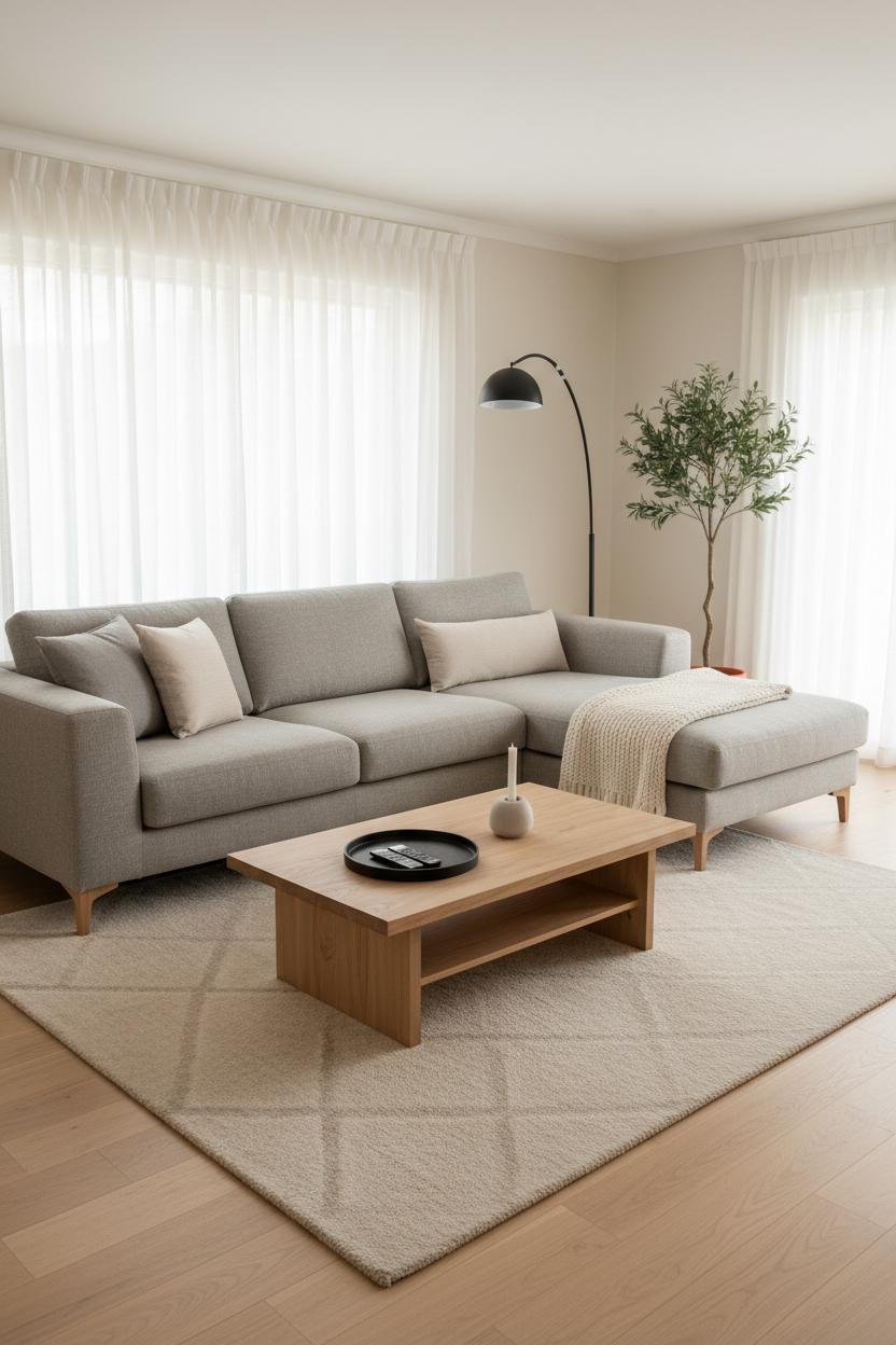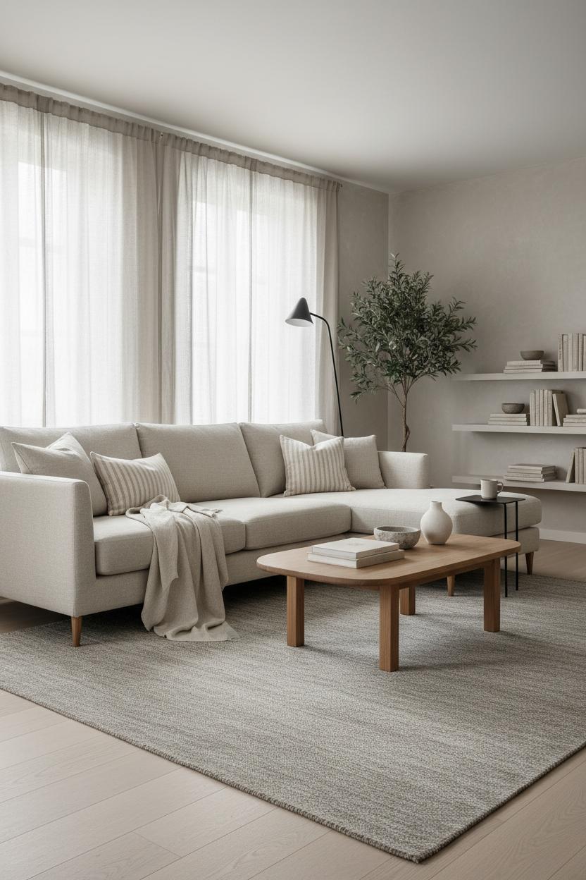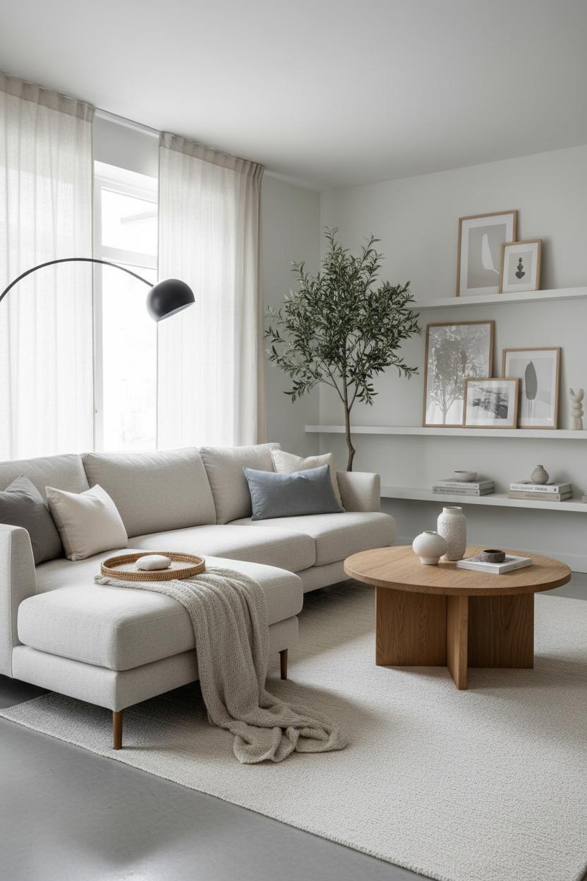 Dreaming of a minimalist living room that still feels warm and lived-in? Think scandinavian decor, a neutral living room palette, and a modern sofa that anchors the space. We’ll show you how small space design shines with a linen sectional sofa, an oak coffee table, and a neutral area rug that layers texture without clutter. Add sculptural light with a black arc floor lamp and a touch of life via an olive tree faux plant. Ready to create a cozy, clutter-free sanctuary you’ll love every day?