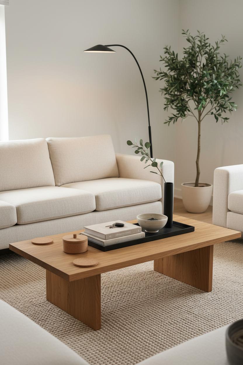 Layer in height thoughtfully by styling in thirds—low (books), medium (bowl), and a taller accent like a slender branch or a single bloom. Anchor the whole scene with a neutral area rug underfoot so the table doesn’t float, then echo its warmth with a linen sectional sofa or a sleek modern sofa nearby. A black arc floor lamp curves overhead to soften the room’s lines and add an artful shadow at night, while an olive tree faux plant in the corner introduces an organic note that makes everything feel alive. For small space design, sneak in function: a lidded box inside the tray hides remotes, slim coasters protect the wood, and a petite catchall keeps clutter from migrating. Edit seasonally—swap the candle scent, change the branch to eucalyptus in winter and flowering stems in spring—so the vignette feels fresh without buying more stuff. When each object earns its place, your oak coffee table becomes the calm center of the room—a daily reminder that simplicity doesn’t mean sparse; it means curated, cozy, and completely you.