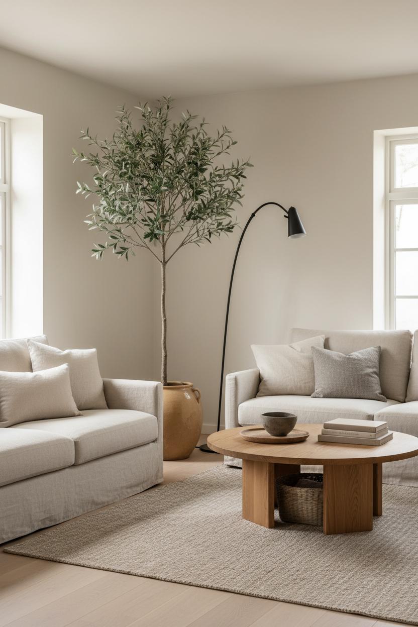 Start with a palette that feels like a deep exhale: warm whites, soft greige, and gentle taupes that let light bounce without feeling stark. In a minimalist living room, materials do the storytelling, so lean into textures that invite touch—nubby linen, matte ceramic, and buttery oak. Linen drapery softens edges and filters daylight, while an understated plaster or limewash finish adds quiet depth to a neutral living room without introducing visual noise. Scandinavian decor shines here: nature-inspired tones, pale woods, and simple forms that are equal parts cozy and composed. Keep metal accents minimal and modern—think a slim black frame, a single iron side table, or a black arc floor lamp to draw the eye upward with one graceful line. If your space craves greenery but the light is fickle, an olive tree faux plant adds height and organic movement without fuss, and it won’t fight the calm of the palette.