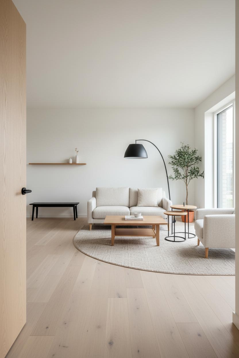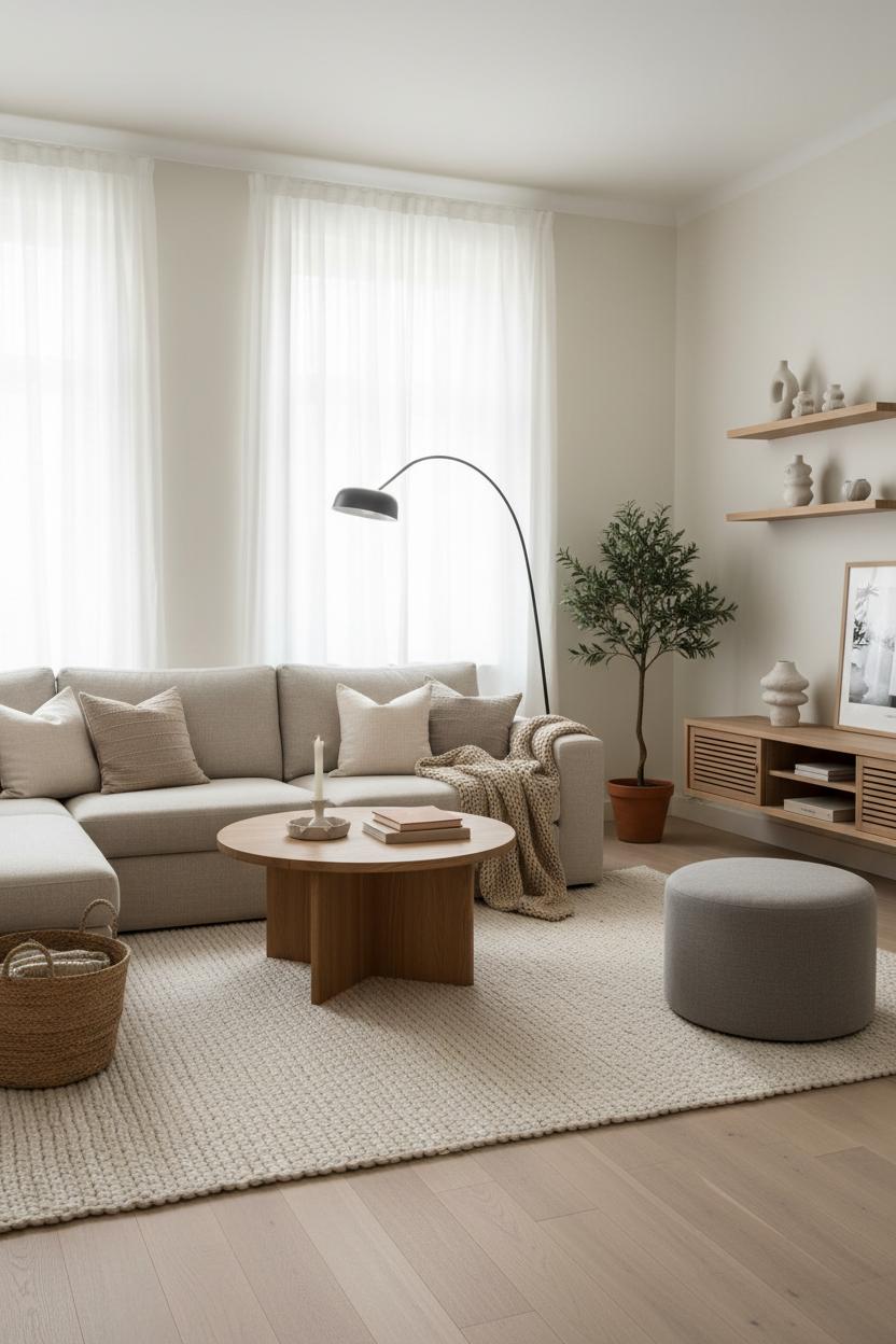 Materials matter here, and they should feel honest to the touch. Layer a neutral area rug underfoot to ground the space, then bring in a pale oak coffee table for subtle warmth and an organic grain that pairs beautifully with creamy upholstery. Add a few nubby pillows, a chunky knit throw, and gauzy curtains to filter light like a Scandinavian morning. Contrast is key too: a black arc floor lamp adds a sculptural note and crisp definition without overpowering the room. Keep surfaces styled but spare—think a single ceramic bowl, a book stack, maybe a candle—so you get the cozy factor without visual noise.
