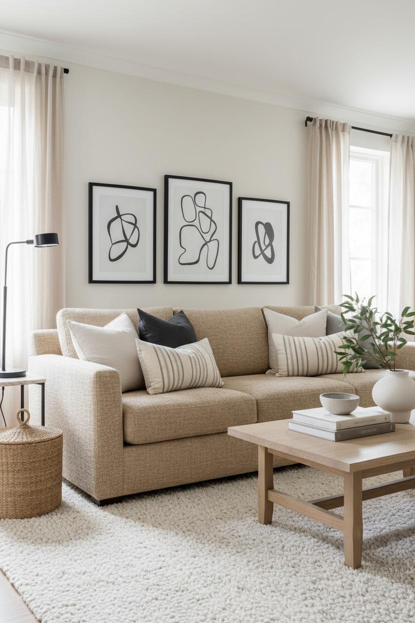 Finally, balance is about editing with intention. Keep surfaces light and purposeful—one stack of favorite books, a low bowl on the coffee table, a single leafy branch in that ceramic planter. If you’re craving art, cluster two or three pieces of black frame wall art for a minimal gallery moment, leaving plenty of negative space so the room can breathe. And embrace small, smart declutter tips: hide cords, corral remotes in a drawer, store blankets in a lidded basket, and rotate decor seasonally so nothing overstays its welcome. The result is a living room that looks effortlessly composed and feels incredibly livable—neutral, cozy, and beautifully balanced.