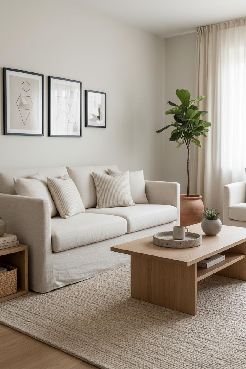 Finally, play with tone-on-tone layers to create depth within your neutral palette. Mix textures—linen, wool, wood, and ceramic—for a room that feels calm yet tactile. Balance low and high silhouettes: the modern sofa’s clean lines paired with a rounded light oak coffee table, grounded by the wool area rug, framed by slim black frame wall art. Bring in warm, dimmable lighting to soften corners and highlight the materials you’ve chosen. With a few mindful choices and simple systems, your living room becomes an effortless expression of minimalist living room decor—calm, cozy, and beautifully clutter-free.