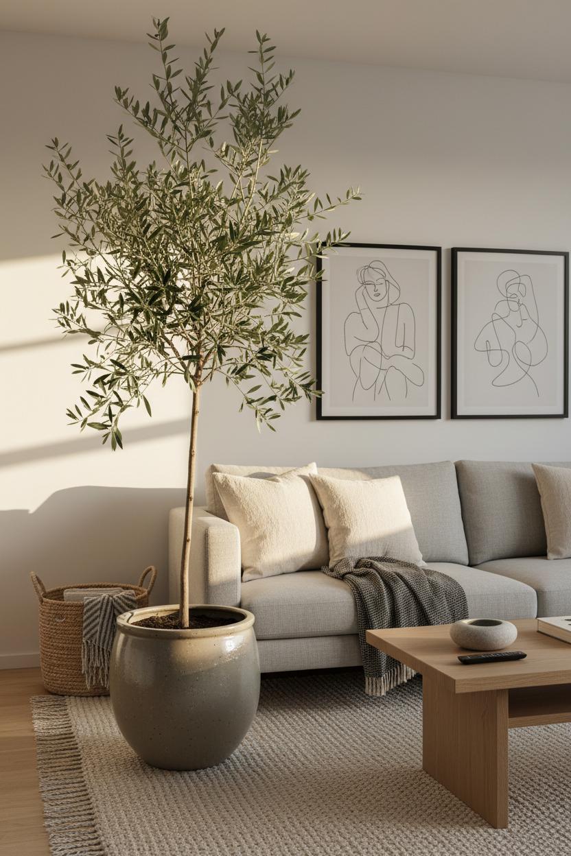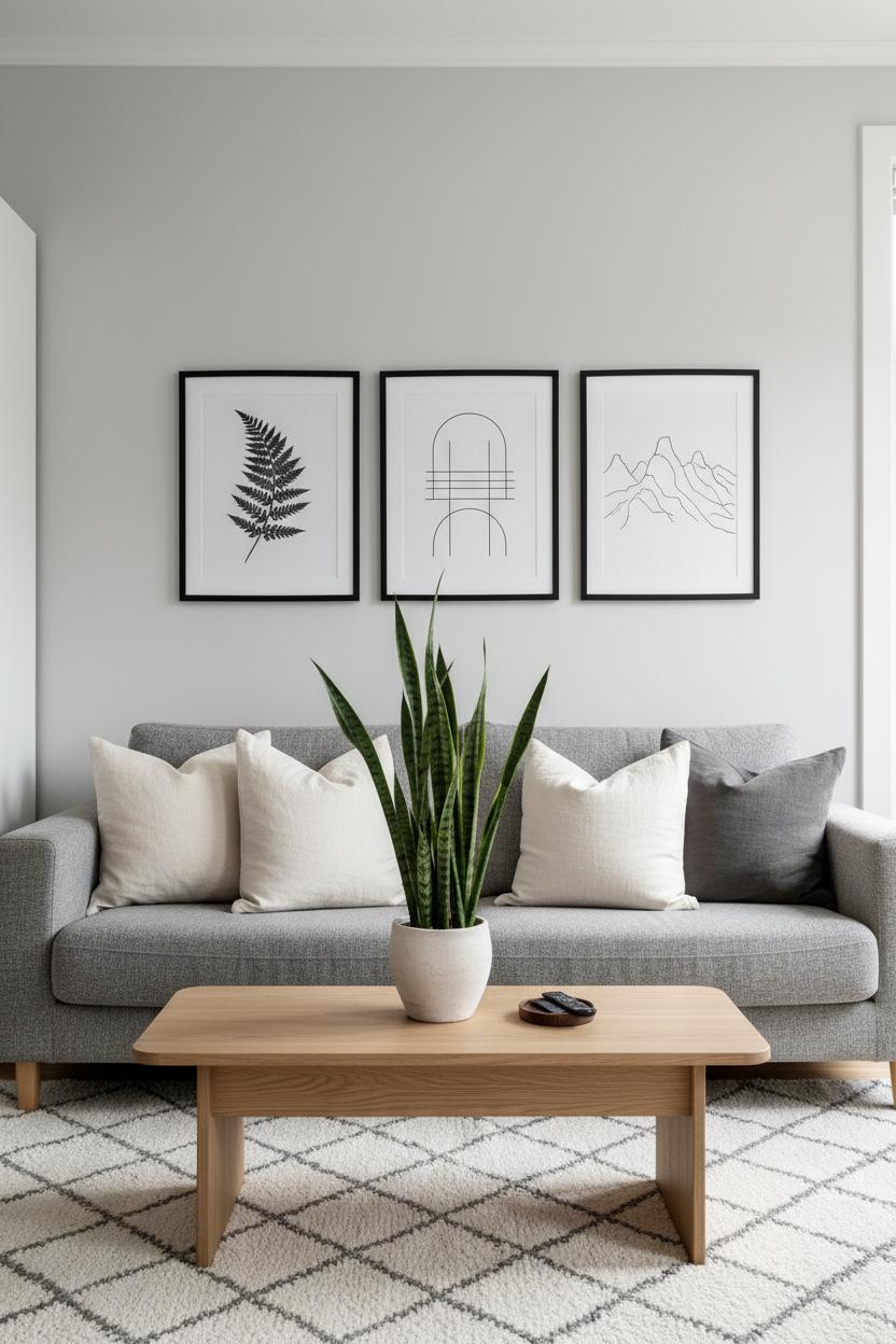 A single, sculptural plant can do more for your minimalist living room decor than a dozen small accents. Think of it like a living art piece: a sleek ceramic planter anchoring a statement silhouette—rubber plant, olive tree, or a tall snake plant—placed where the light kisses it in the afternoon. The matte or lightly speckled finish of the planter keeps things calm and tactile, a thoughtful nod to neutral home design that pairs beautifully with a modern sofa layered in linen throw pillows. Let the greenery rise beside a light oak coffee table and over a wool area rug, and you’ve suddenly added height, softness, and movement without visual noise. To complete the look, echo the plant’s lines with black frame wall art—simple, graphic, and unfussy—so the room feels curated, not crowded.