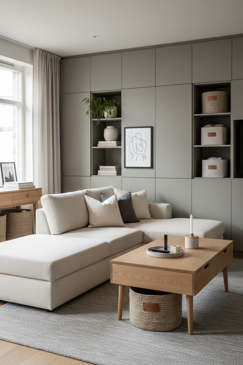 When storage is streamlined, your living room instantly feels calmer—like a deep exhale you can see. Think built-in shelving and low cabinets painted to melt into the walls, a quiet backbone for minimalist living room decor that hides the chaos and highlights what you love. Keep the doors closed on the everyday clutter—remotes, board games, extra cords—then style the open cubbies with a few grounding pieces: a leafy ceramic planter for height, a small stack of design books, and a piece of black frame wall art leaned casually for that effortless, collected vibe. A modern sofa with a storage chaise is a total game changer, swallowing throw blankets and kids’ toys between movie nights, while a light oak coffee table with a lift top keeps journals, chargers, and candles at arm’s reach without crowding the surface. Tuck woven baskets under consoles and inside built-ins; they add texture and make tidying feel quick. Soften the whole scene with a wool area rug and a couple of linen throw pillows in muted tones to underscore your neutral home design—cozy, not sterile.