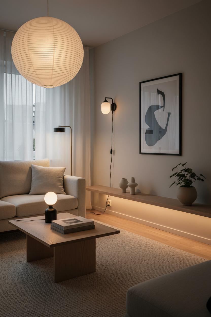 If minimalism is the editing, lighting is the mood music. Think in layers: a soft ceiling glow for ambience, a couple of warm-pool table lamps for tasks, and a subtle accent or two to highlight texture. In a neutral home design inspired by a Scandinavian interior, swap harsh overhead glare for diffused light—fabric or paper shades, frosted bulbs, even a rice-paper lantern—so illumination feels like a gentle hug. Choose warm bulbs in the 2700K–3000K range; they flatter skin tones and natural materials, making wood, linen, and clay read cozy rather than stark. Add dimmers wherever you can. A dimmer lets the same room glide from morning brightness to evening calm, which is the secret sauce of minimalist living room decor. Layer a slim floor lamp in a corner, tuck a petite lamp on the light oak coffee table, and run a whisper of LED under a shelf to make objects float without visual noise.