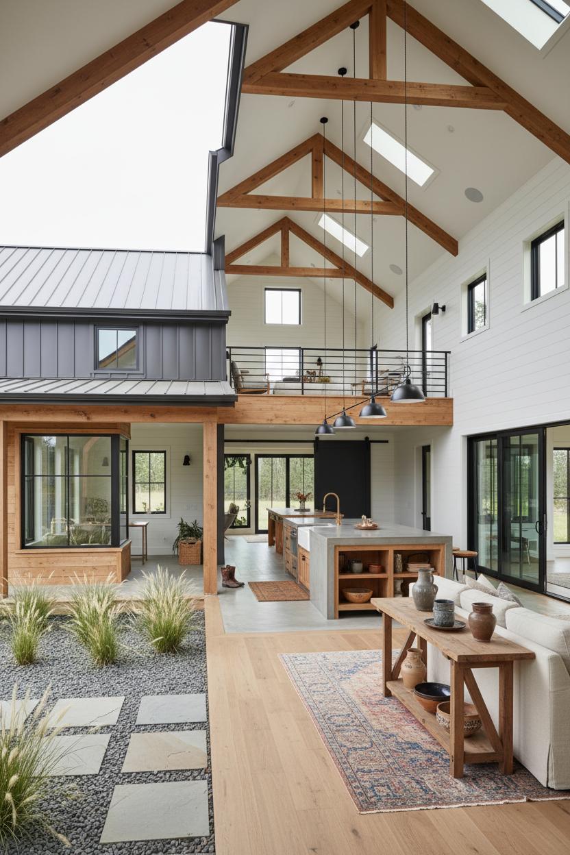 Inside, think airy volumes and quiet, tactile layers. Whitewashed walls bounce light into soaring ceilings with exposed trusses, while polished concrete or wide-plank oak floors add warmth underfoot. If you’re craving texture without the commitment, peel and stick shiplap makes an easy weekend upgrade behind a sofa or in the entry. Industrial notes—like barn door hardware in matte black and streamlined farmhouse lighting—bring in that subtle workshop energy without feeling heavy. Mix linen sofas with a vintage rug, a live-edge console, and collected pottery for a rustic home design that feels curated, not theme-y. The palette stays neutral and earthy, letting metal, wood, and stone do the talking; the luxury comes from simplicity, scale, and light.