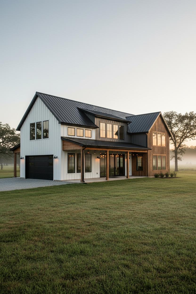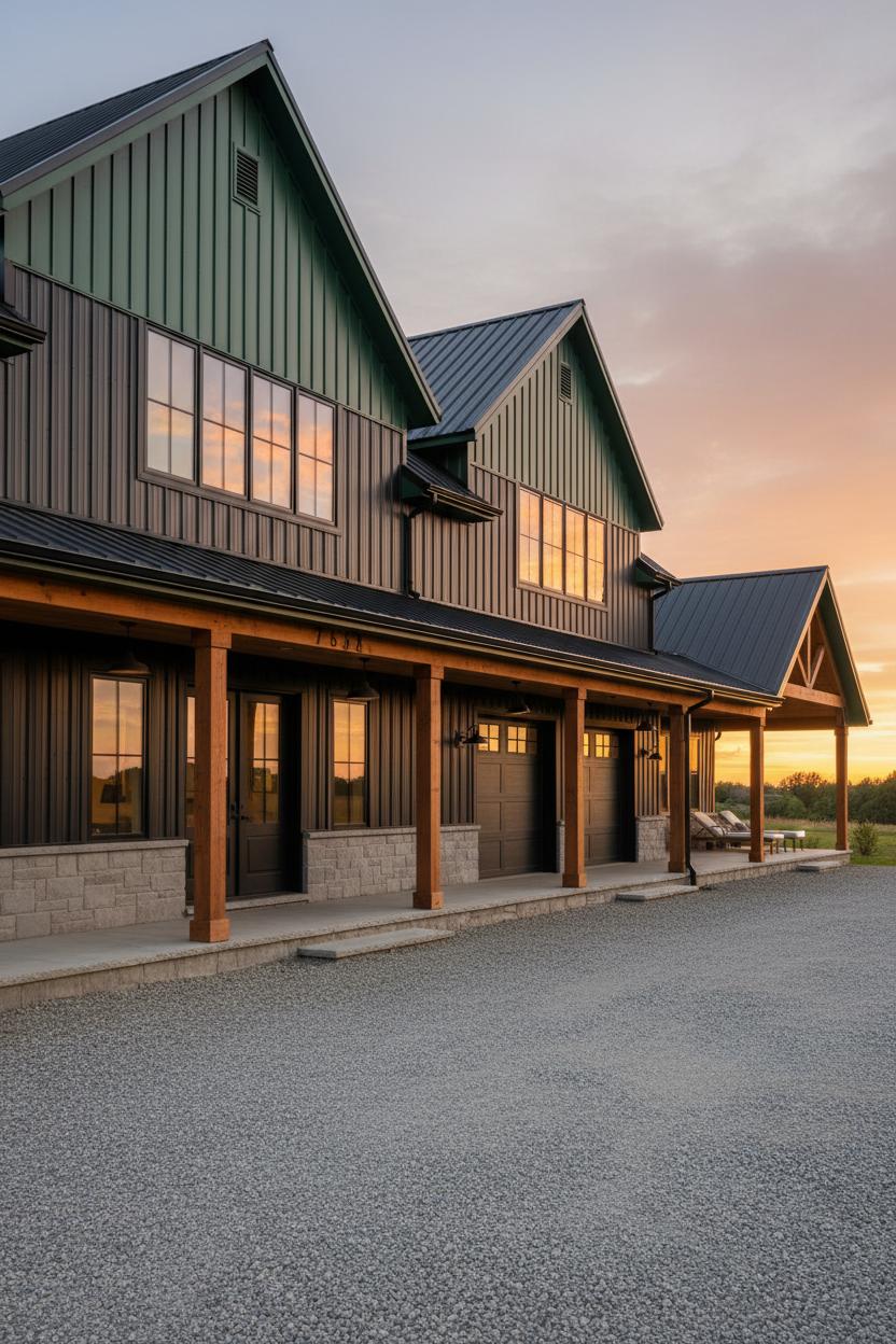 When you’re dreaming up curb appeal for a barndominium, metal siding panels are the secret sauce that makes “rustic meets luxury” feel effortless. Think crisp vertical ribbing in charcoal or matte black playing against warm cedar posts, a stone skirt, and sleek black window trim that frames sunset views like artwork. This is where modern farmhouse vibes get an instant upgrade: hard-working finishes with high-style lines that look just as good from the gravel drive as they do in a drone photo. Mix profiles—smooth architectural panels on the gables, corrugated on side elevations—for subtle texture shifts, and let farmhouse lighting in aged brass or powder-coated black add that welcoming glow along the porch. These barndominium ideas are all about contrast and harmony: metal that resists hail and humidity, wood that softens the silhouette, and color blocking that makes your entry pop without feeling fussy. If your heart leans classic, choose soft white cladding with black accents; if you’re feeling bolder, try deep forest or moody navy, then repeat the hue on the garage doors for a custom, pulled-together look.