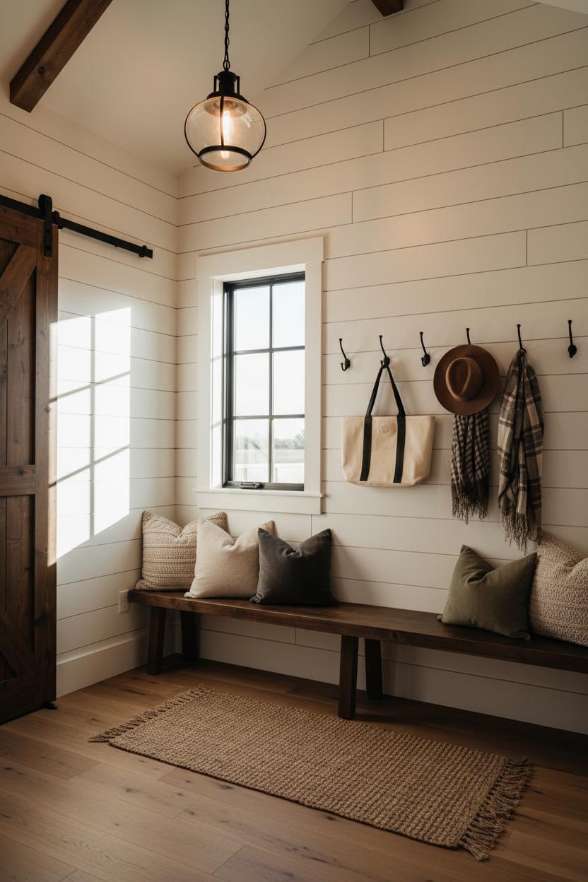Details make the difference. A sliding panel with sturdy barn door hardware hides a tall cleaning closet or a fold-down ironing station, while peel and stick shiplap adds instant texture behind coat hooks for that effortless rustic home design vibe. Durable finishes are your friend—sealed concrete or brick-look tile underfoot, a utility sink for paint brushes and garden clippings, and even a petite dog wash tucked under a window trimmed in crisp black window trim for a custom, high-end look. If you’re working with metal building homes, use the structure to your advantage by carving built-in lockers between framing bays or wrapping a corner in metal siding panels as a tough, wipeable wainscot that still reads stylish. Layer in warm farmhouse lighting over the bench and a motion-sensor sconce by the entry so hands-free glow greets you when arms are full.