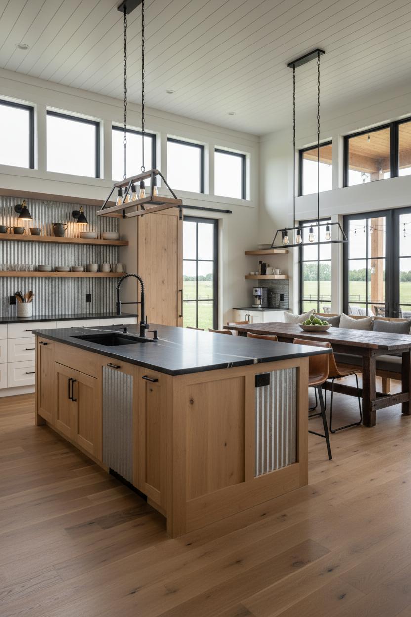 Think of the kitchen and dining zone as the heart of your barndominium, where luxe textures meet workhorse functionality. Start with a generous island in veined quartzite or honed soapstone, then contrast it with warm white oak cabinetry and matte black accents for that effortless modern farmhouse mood. Oversized windows with black window trim frame the pasture views like art, washing the space in natural light while anchoring your palette. If you’re looking for smart barndominium ideas that stretch the budget, consider using metal siding panels as a tough, wipeable backsplash or on an island kick plate—they bring subtle industrial sheen and tie back to the DNA of metal building homes. Hide the mess with a sliding pantry door on sleek barn door hardware and tuck appliances into a scullery so the main kitchen stays gallery-clean. Layer in tactile moments—a touch of unlacquered brass, leather stools, hand-thrown pottery—to soften the lines and keep that welcoming, rustic home design warmth.