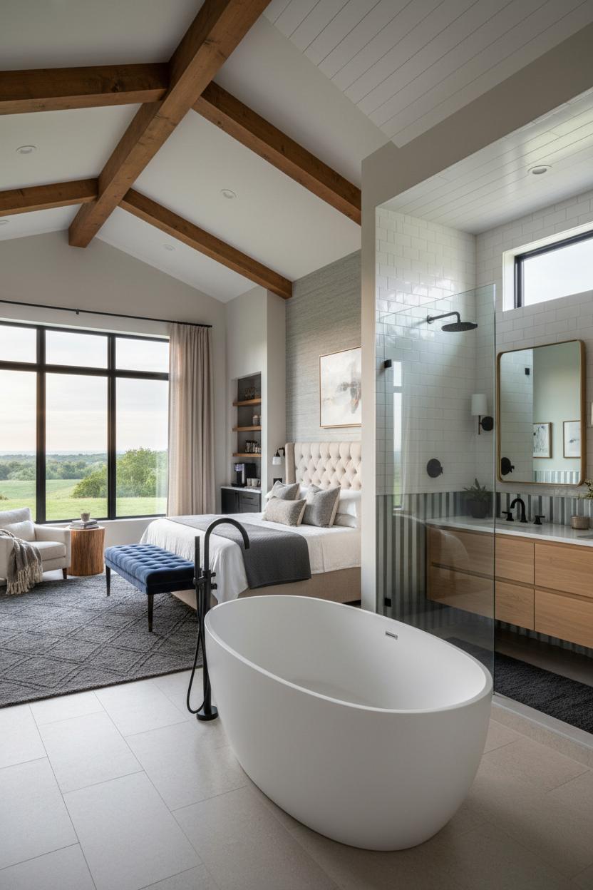 Step into the spa bath and let the mood switch to serene and sculptural. A freestanding tub anchors the space while a glassy wet-room shower gleams under soft farmhouse lighting—mix matte black fixtures with warm brass for a collected look. If you love breezy, cottage-bright walls, consider peel and stick shiplap behind the vanity or as a ceiling treatment; it’s a weekend-friendly update with maximum charm. Float the vanity to keep things airy, add wide drawers for towel stacks, and flank a statement mirror with sconces at eye level. Radiant floors, a teak bath mat, and a plush runner keep toes toasty, while skylights or a transom borrow daylight from the suite without sacrificing privacy. For a quiet architectural wink, echo the exterior’s metal siding panels as a shower wainscot or vanity backsplash—they’re unexpected, industrial-chic, and wipe clean like a dream.