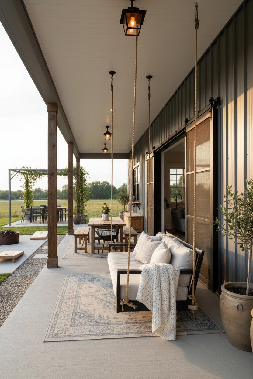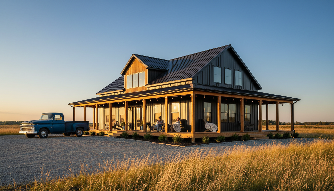 Imagine stepping from your great room onto a wide, breezy porch where the line between inside and out practically disappears. That’s the magic of outdoor living in metal building homes: big spans, generous overhangs, and porches that stretch like a ribbon around the house, creating instant gathering zones for morning coffee or twilight charcuterie. One of our favorite barndominium ideas is to design a barndo floor plan that naturally spills onto a patio—think oversized sliders, a pass-through kitchen window, and a covered dining nook that stays cool all summer. Crisp black window trim pops against durable metal siding panels, and the contrast feels fresh and modern farmhouse while staying true to the home’s hardworking bones.