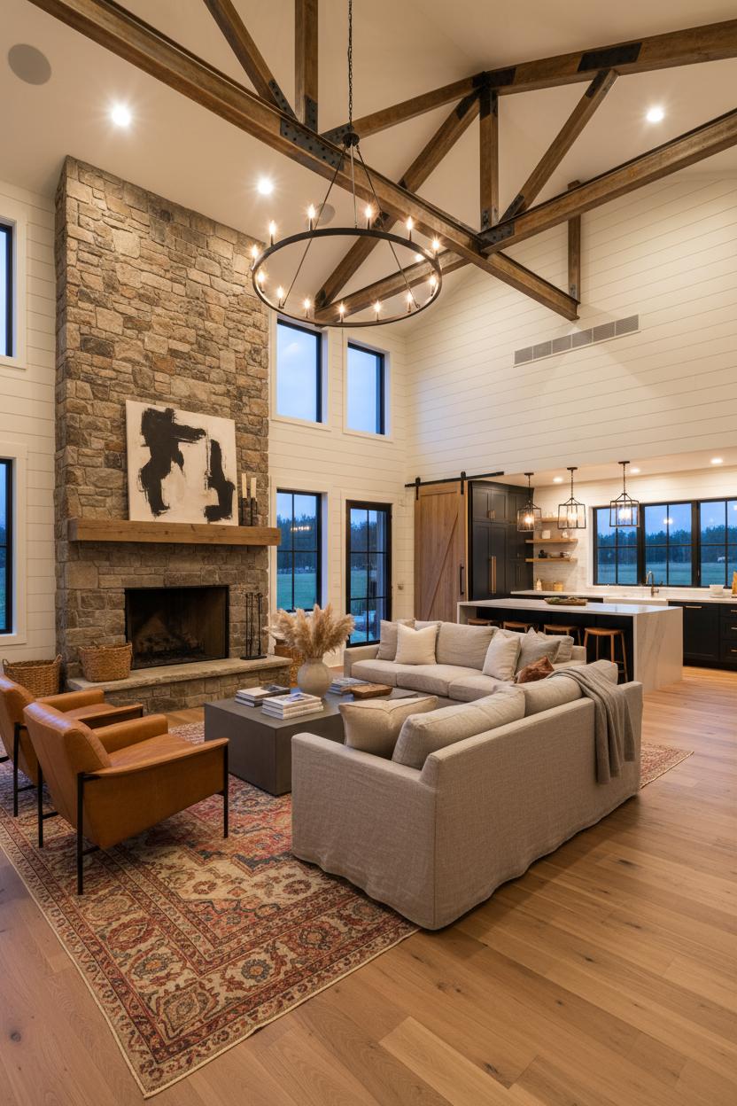 Start with the envelope: durable metal siding panels bring crisp lines and endurance, especially when paired with black window trim that frames pastoral views like art. Inside, layer in character without demolition—peel and stick shiplap can turn a plain wall into a farmhouse feature in an afternoon. Slide open spaces with barn door hardware in bronzed or iron finishes for that easy, tactile moment between rooms. Then dial in the glow: farmhouse lighting—oversized pendants, lantern sconces, or a wagon-wheel chandelier—grounds the volume of tall ceilings and adds instant warmth after sunset. Let your materials do the talking: a tumbled stone fireplace, wire-brushed oak floors, and hand-forged pulls play beautifully with polished concrete, quartz, and sleek cabinetry. Keep decor edited but textural—linen slipcovers, woven baskets, vintage rugs—to let those architectural gestures shine. Whether you’re sketching your first barndo floor plan or refreshing an existing space, the magic lives in mindful juxtaposition. Modern comforts don’t cancel country character; they highlight it. With a few strategic choices—and a willingness to mix soul with sophistication—you can craft a sanctuary that feels intentionally collected, irresistibly cozy, and perfectly now.