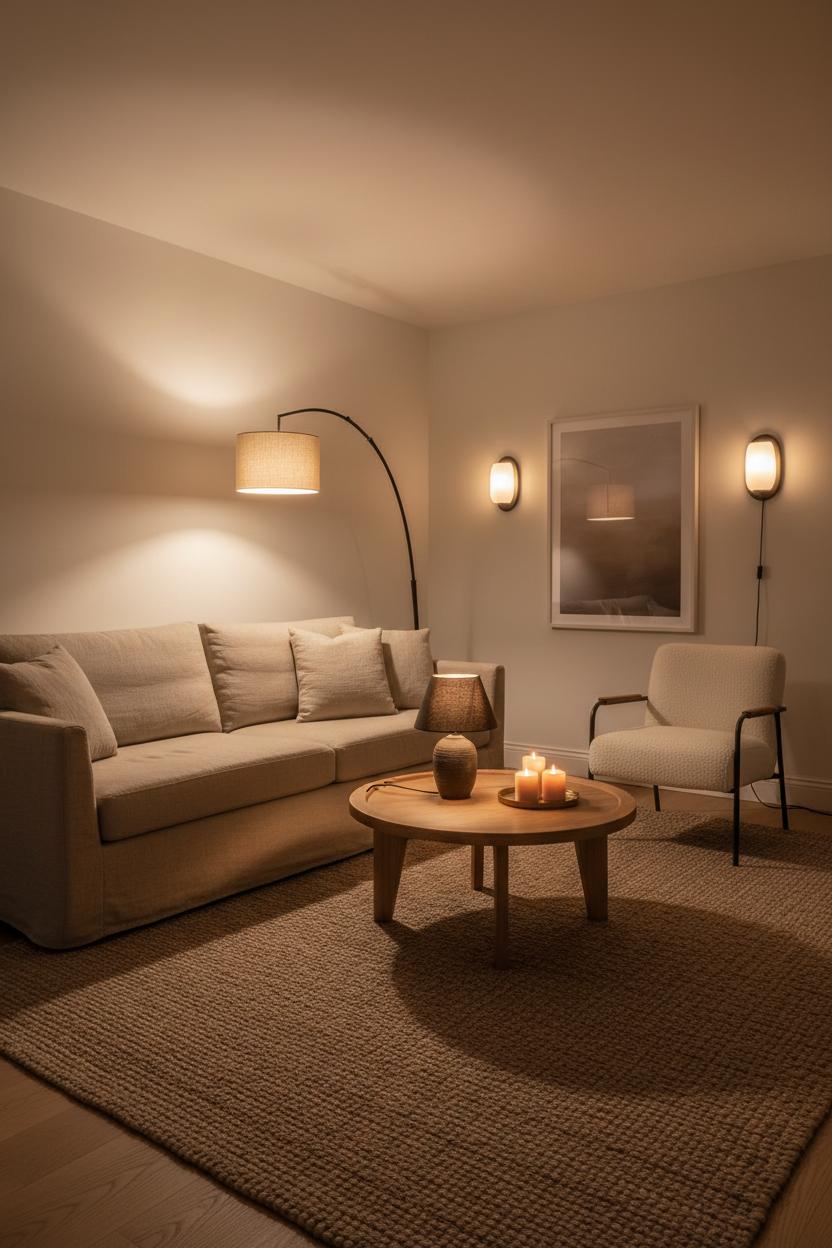 Bulb choice matters just as much as placement. Swap in a warm white LED, 2700K–3000K, so textures read tactile and inviting rather than flat. A linen shade on your floor lamp diffuses light beautifully, skimming over woven knots in the jute area rug and the nubby boucle without blowing out their character. For small space layouts, I love forming a “triangle of light”: the black floor lamp in one corner, a low lamp on the oak coffee table, and a soft glow across the room—maybe a plug-in sconce or a candle cluster on a tray. The eye moves around the space, and suddenly the room feels larger and layered, not cluttered. Add a dimmer or smart bulb to shift from lively evening hangouts to sleepy late-night ambience with one tap.