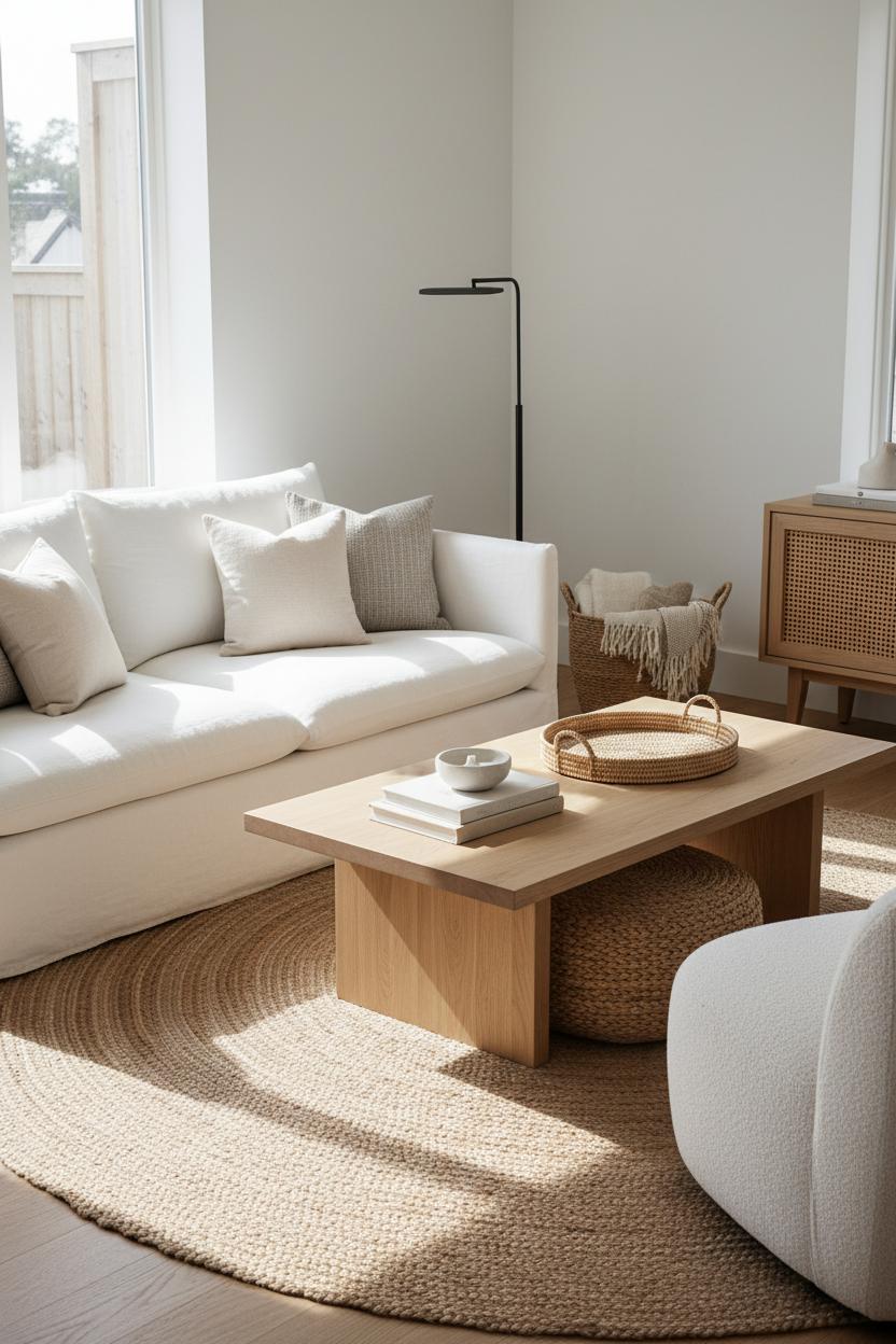 For balance, add a bit of contrast and curve. A cozy boucle accent chair keeps the story textural while breaking up all the flat weaves, and a sleek black floor lamp gives the room a grounding note so the neutrals don’t float away. In a small space, think in layers rather than bulk: airy silhouettes, pieces on legs, and a generous rug to visually expand the footprint. Vary the scale of your weaves—tight cane next to chunky jute, a smooth linen pillow beside a nubby knit—to keep the eye moving. Style that oak coffee table with a stack of linen-bound books and a ceramic bowl, tuck a woven ottoman under it for extra seating, and let your textiles be the color story. This is modern decor at its most livable: a soothing, collected mix of natural textures that invites you to kick off your shoes, sink into the sofa, and stay a while.