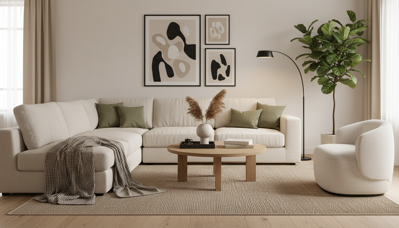 Start with the foundations that make a room feel grounded and soft underfoot: a jute area rug to bring in earthy texture, then anchor with a low, sink-in linen sofa that instantly warms the palette. Add dimension with an oak coffee table whose rounded edges keep the flow easy, and balance the warmth with a slim black floor lamp that casts a gentle pool of light at dusk. For extra coziness, a boucle accent chair adds that cloudlike, touch-me layer without stealing the show. Keep lines clean, but mix shapes—curved with straight, matte with nubby—to create quiet depth. Style surfaces sparingly: a tray for remotes, a sculptural bowl, branches in a clear cylinder. If storage is tight, look for closed bases and open shelves, and choose leggy pieces to keep sightlines open in a small space. These are the kind of living room ideas that make modern decor feel human—inviting, tactile, and easy to live with—so your space feels collected, not staged, and beautifully you.