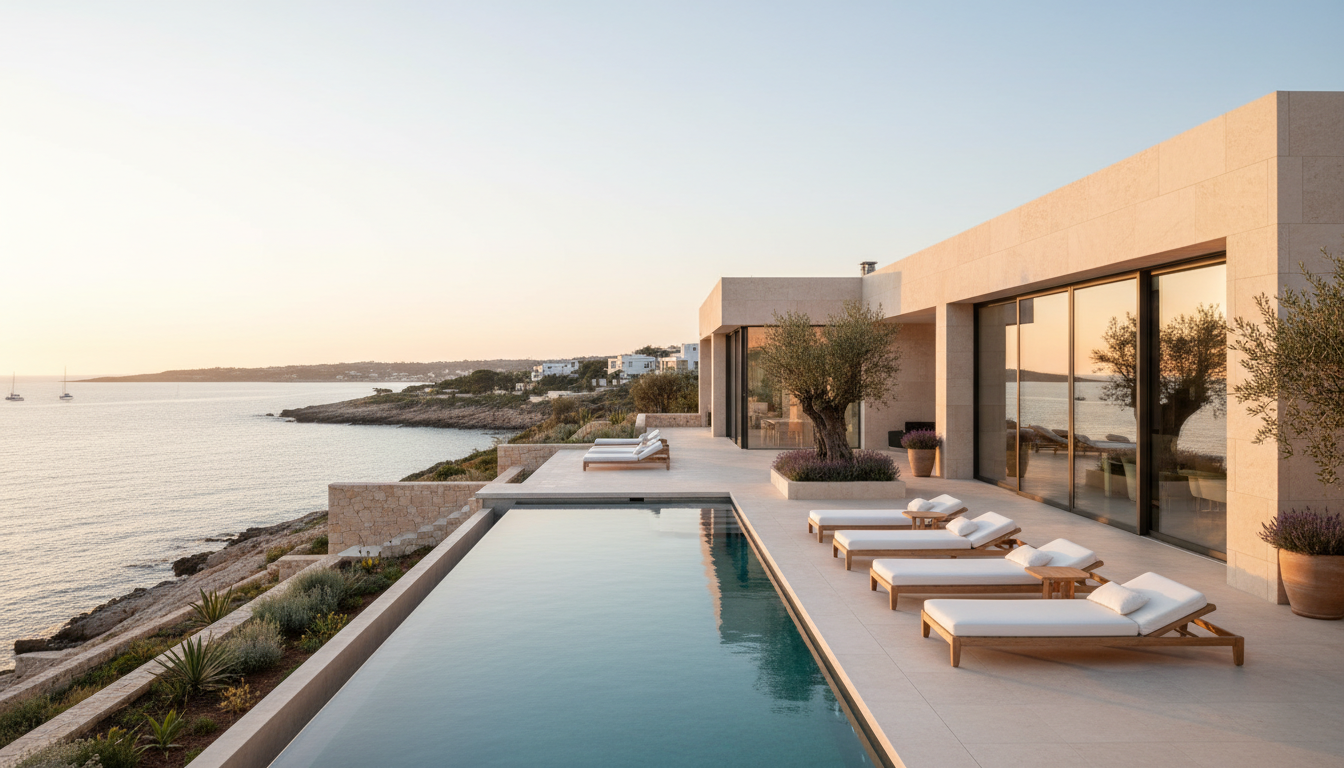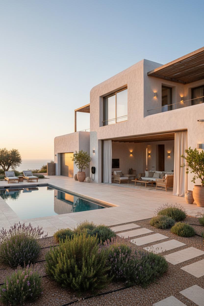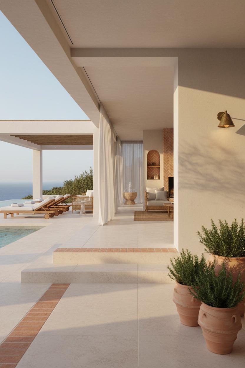 Start with the foundation beneath your feet: creamy travertine pavers that blur the line between terrace and living room, creating a seamless flow that defines modern mediterranean indoor outdoor living. Their softly honed surface keeps cool under the sun and picks up the villa’s natural light like water—muted, pearly, timeless. Pair that with chalky limewash stucco and you get walls that actually breathe; they shift with the day, from pale dawn mist to golden late-afternoon glow. It’s an effortless canvas for coastal architecture, letting shadows from olive branches dance across façades while sea breezes thread through courtyards. In this kind of villa design, the palette is quiet but not shy—the textures do the talking, and every step across those travertine pavers whispers vacation.