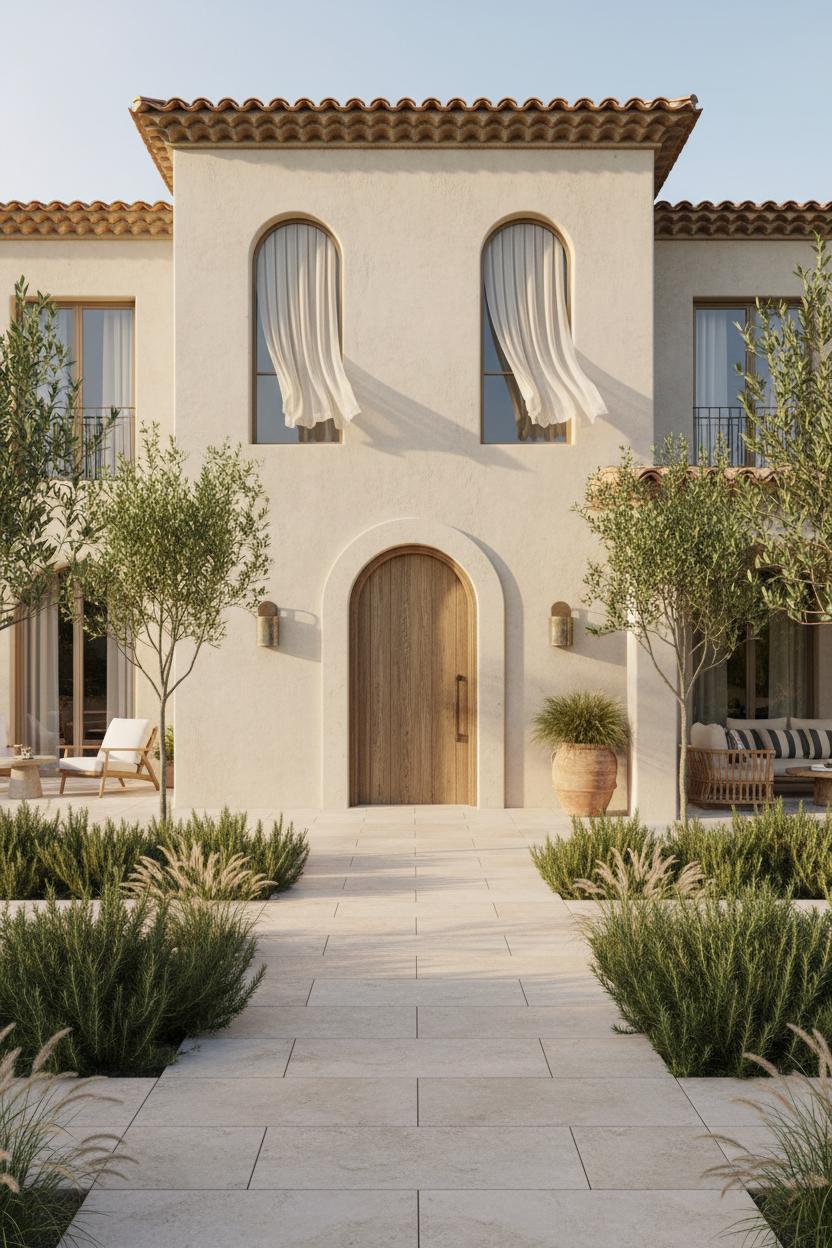 Start at the ground with a walkway of travertine pavers set in a clean, generous pattern; they read elegant and coastal, and their soft color keeps everything feeling airy. Frame the path with aromatic rosemary, silvery olive trees, and feathery grasses so the approach feels relaxed yet intentional. Flank the entry with a coastal wall sconce on each side—soft, diffused light at dusk is the easiest curb-appeal upgrade. Keep windows tall and rhythmic, then soften them with linen sheer curtains that hint at movement and invite curiosity without sacrificing privacy. If there’s room for a small terrace or loggia up front, ground it with a rattan patio set layered with striped cushions; the texture nods to the shore while keeping things elegantly casual.