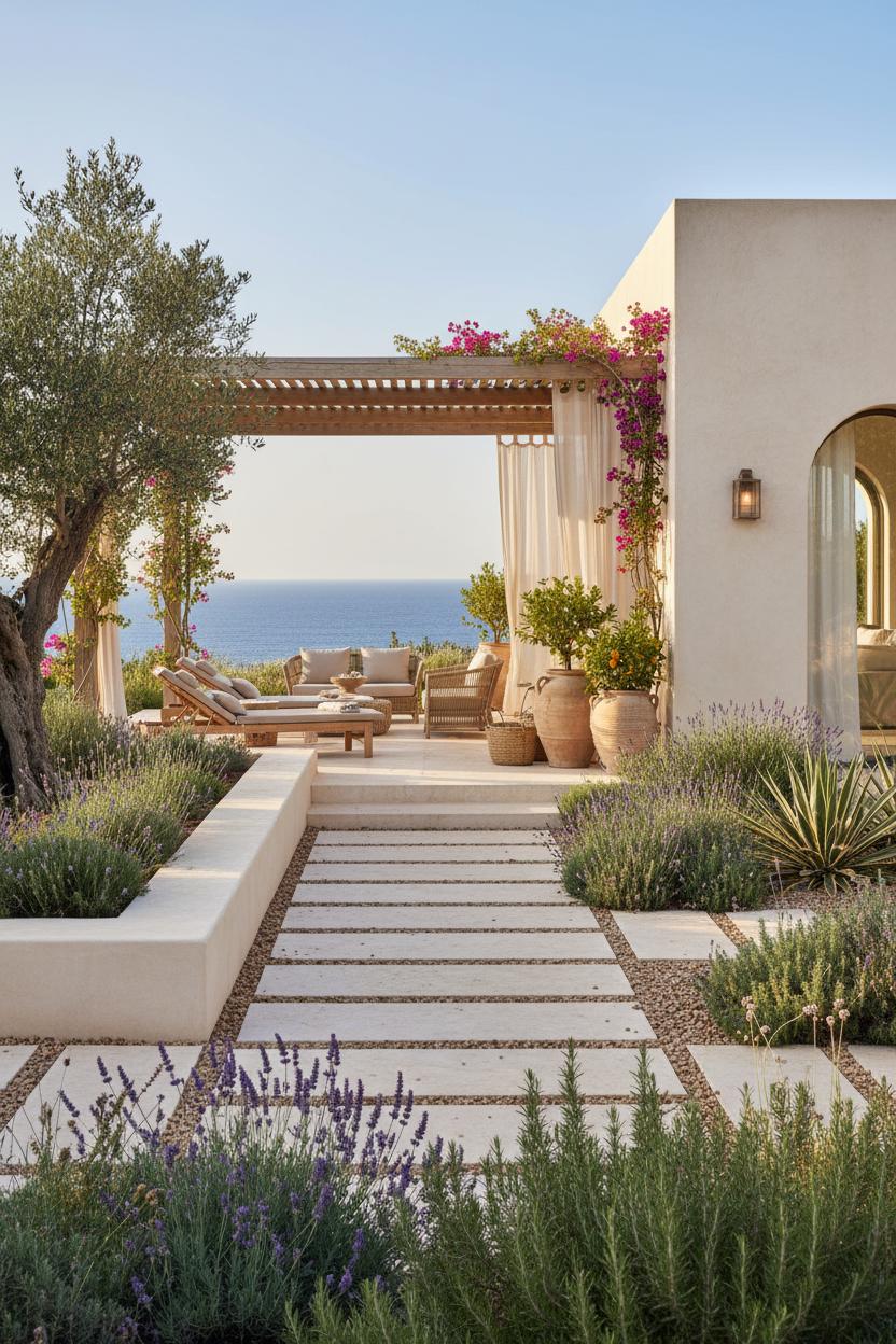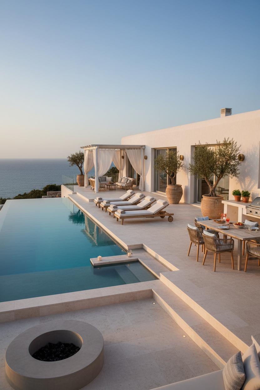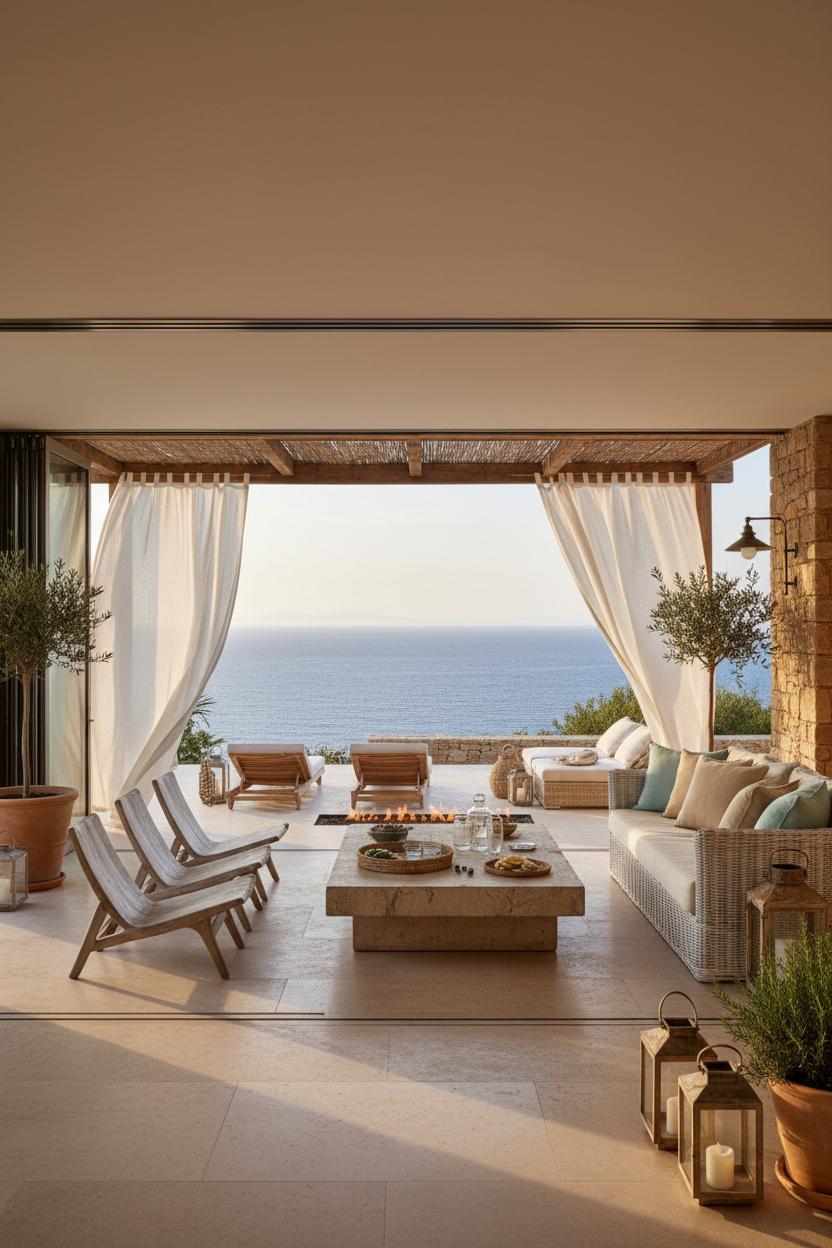Out here, the living room slips effortlessly into the breeze, the sea doing its slow, shimmering dance just beyond a terrace of cool travertine pavers. Picture a cluster of teak outdoor lounge chairs—low, sculptural, and sun-kissed—paired with a generous rattan patio set layered in sandy linens and sea-glass tones. This is the soft center of a modern mediterranean retreat, where the palette is chalky white, driftwood taupe, and a whisper of surf blue. Floaty linen sheer curtains sway from a pergola, filtering light like a beach morning and softening the edges between inside and out. It’s the kind of villa design that prizes ease: a broad stone coffee table for sunset spreads, woven trays for olives and citrus, and oversized cushions that invite you to stretch out and stay. Everything feels collected rather than staged—organic textures, sunbleached woods, quietly luxurious details that nod to coastal architecture without shouting.