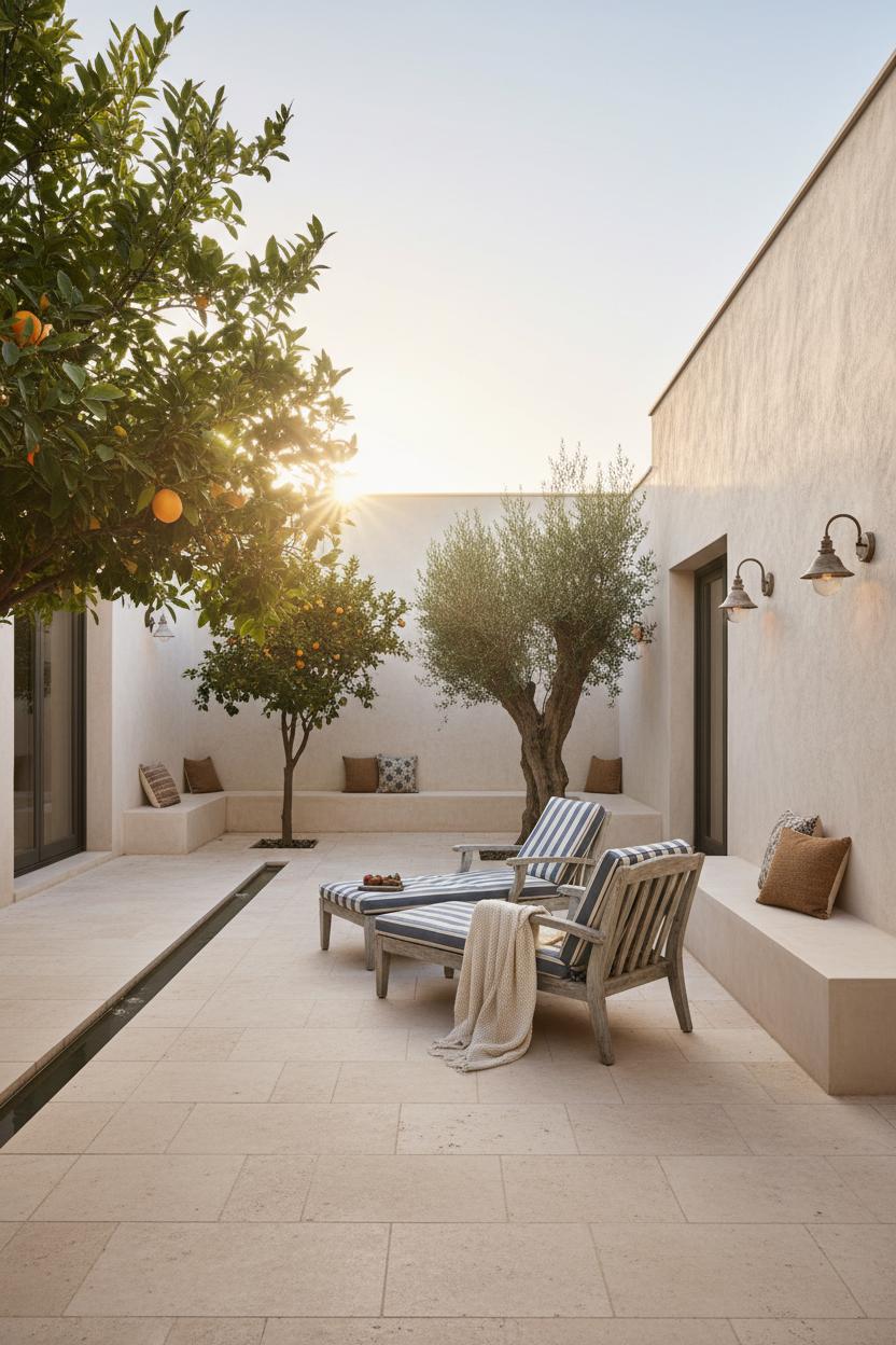Think of the courtyard as the heartbeat of indoor outdoor living—a private open-air room where morning light pours in and ocean breezes thread their way through citrus and olive trees. In a modern mediterranean villa design, this space is equal parts sanctuary and social hub: travertine pavers stay cool underfoot, a slender water rill adds a hush, and low, built-in plaster benches invite slow conversations. For lounging, teak outdoor lounge chairs age into a silver patina that feels perfectly coastal; add striped cushions and a throw for that effortless, sun-washed look. At dusk, a coastal wall sconce or two casts a warm pool of light on stucco walls, and suddenly the courtyard becomes a glowing jewel box—one of those luxury home ideas that looks good in every season. It’s coastal architecture that prioritizes flow, texture, and the pleasure of being outside without ever leaving home.