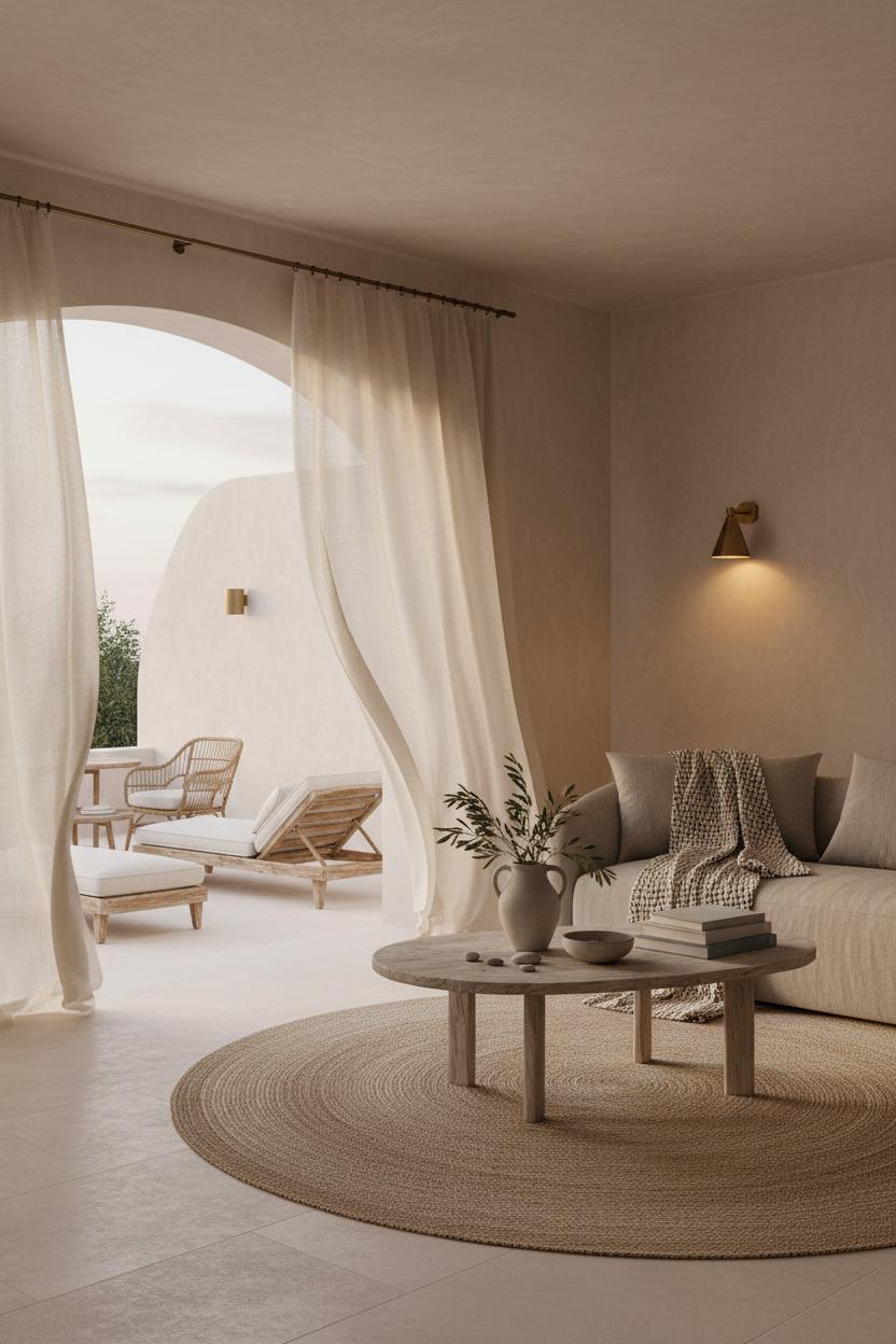 Think of the softest sea breeze made visible—that’s exactly what linen sheer curtains do in a modern Mediterranean room. They filter the light into a pale, honeyed glow and blur the edges between interior and landscape, giving every corner that weightless, coastal calm. Against velvety plaster walls—limewashed, slightly chalky, a touch imperfect—their transparency feels intentional, never flimsy. This is where the romance of coastal architecture meets mindful villa design: a restrained palette of ecru, dune, and driftwood; the nubby hand of natural fibers; and silhouettes that feel rounded and welcoming. Layer jute or sisal underfoot, add linen on sofas and bed canopies, and let a single artisan throw or vintage ceramic ground the space with character. For anyone collecting luxury home ideas, these materials are the ones that age beautifully, getting better the more you live with them.