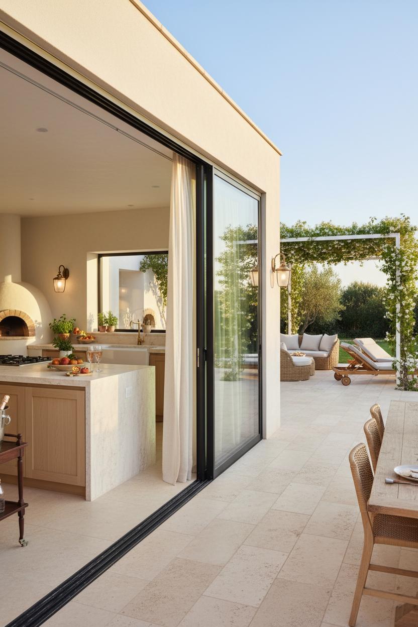 As the day cools, lighting takes over the mood board. A coastal wall sconce in weathered brass adds a salt-air patina, while lanterns flicker across tabletops and steps, pooling warm light over the travertine. Keep the lines low and open to honor the horizon; let seating curve to cradle conversation and frame the view. Potted olives and rosemary flank the edges, and a linear fire feature or petite clay chiminea adds just enough glow for late-night stories. With wide stacking doors and matching floor finishes, the indoor outdoor living transition becomes nearly invisible—your sofa flows into the terrace, your dining table extends beneath the stars, your soundtrack is tide and laughter. These are luxury home ideas that are as practical as they are dreamy.