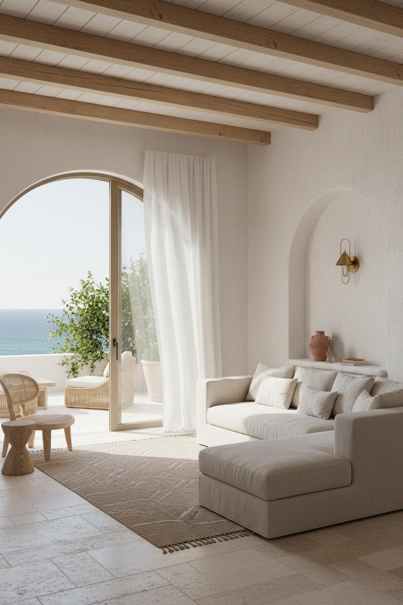 Beyond the courtyard, the loggia becomes your living room without walls. Arched openings frame the horizon while deep eaves offer shade that’s cool and cinematic. Here, linen sheer curtains drift like sails, softening sunlight and giving the breeze something to play with. Style the space with a rattan patio set layered with nubby, neutral textiles, then ground it with a limestone or jute rug for tactile comfort. The palette is quiet—bone, sand, and sea-glass greens—so the materials do the talking. This is where modern mediterranean restraint meets coastal ease: plaster, stone, wood, and woven fibers in a timeless dialogue, proof that the best luxury home ideas are often the simplest ones done beautifully.