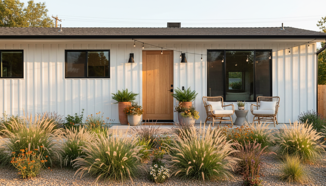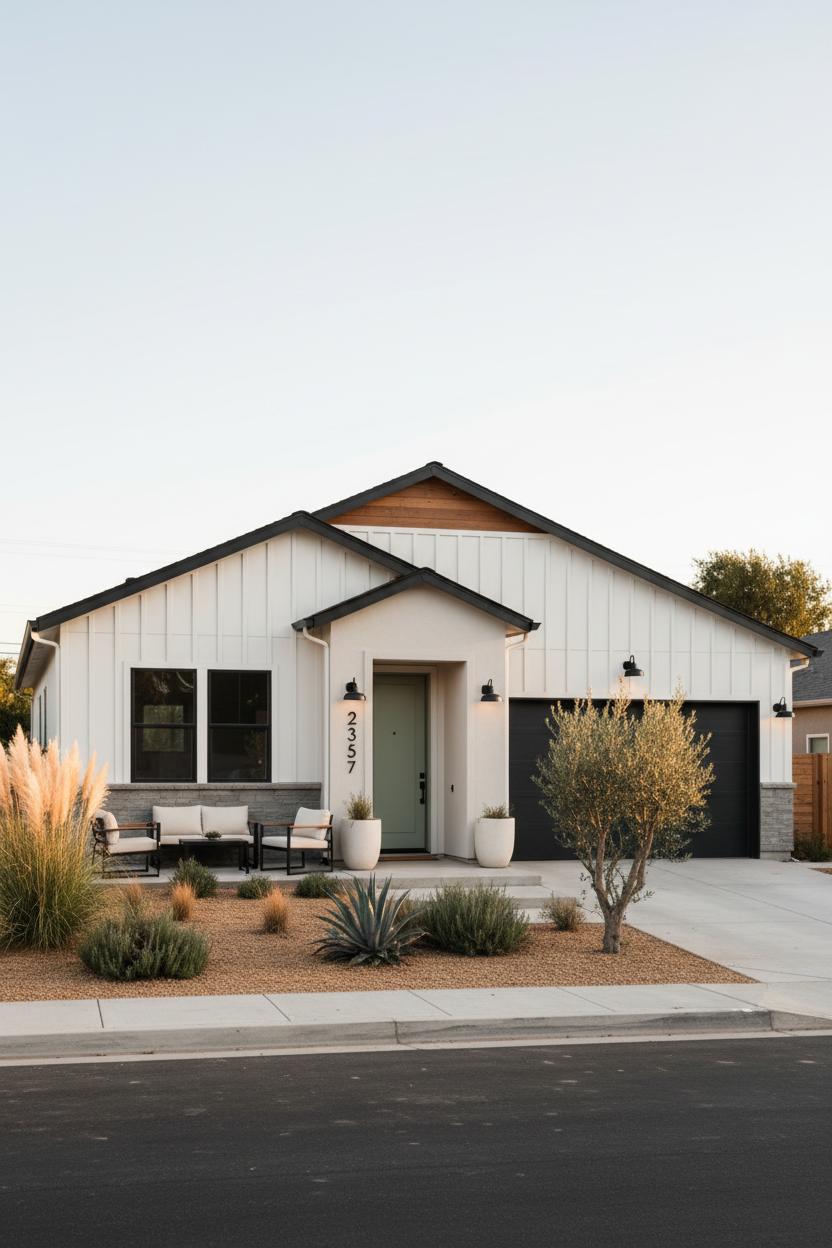 Don’t forget the landscape layer to soften all that handsome structure. Drought tolerant plants—feathery grasses, sculptural agave, silver-green rosemary, and olive—bring movement and color without heavy maintenance, and crushed gravel or decomposed granite provides a tonal bridge between hardscape and foundation materials. Echo your siding palette in planters and front-door paint so everything feels intentional from curb to threshold. For a polished finish, align material transitions with window and door heads, keep battens consistent in spacing, and limit your palette to three core materials with one accent color. The result is a ranch remodel that feels elevated yet effortless: a modern farmhouse-inspired exterior design that boosts curb appeal today and will still look timeless a decade from now.