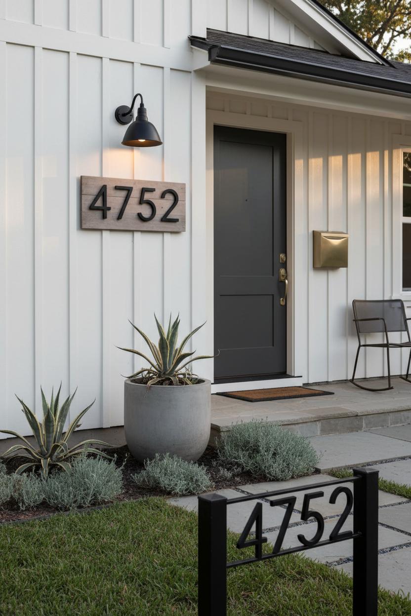 Placement is everything. Mount the numbers near eye level by the door, and pair them with black exterior light fixtures that wash the digits in a gentle glow for nighttime readability. On board and batten siding, a narrow plaque or wood strip behind the numbers gives a smooth surface and a tailored look. Consider echoing finishes across the porch—match the metal to your mailbox or the frame of a porch furniture set—so the whole entry feels intentional. If your home sits back from the street, repeat the numbers on a low fence or a minimalist post near the drive. Anchor the scene with drought tolerant plants in sculptural pots and a tidy path; the greenery softens the lines while the numbers stay the star. With such a small change, your entry suddenly feels curated and up-to-date, the kind of detail that makes visitors slow down and smile. It’s a budget-friendly move with big visual payoff, nudging your ranch house toward that magazine-ready glow and tying your whole exterior design together—proof that sometimes the smallest elements do the heaviest lifting in a modern farmhouse-inspired makeover.
