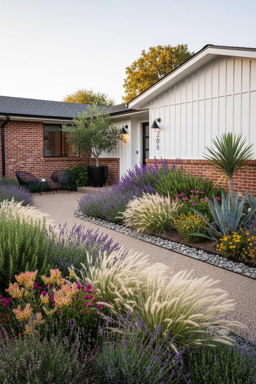 A low-slung ranch house loves a little lift from plants that billow, drift, and sway, and the best part is you don’t need a thirsty lawn to get that soft, inviting look. Think drought tolerant plants with movement and fragrance—clouds of lavender and catmint along the walk, airy plumes of Mexican feather grass catching the light, and sculptural anchors like agave or yucca to ground the corners. Layer in silvery artemisia and low mounds of thyme to spill over pathways, then weave in color with penstemon, yarrow, and sunset-hued kangaroo paw for a palette that feels modern but warm. This kind of planting scheme instantly boosts curb appeal while complementing a modern farmhouse exterior design, whether your ranch remodel kept classic brick or added crisp board and batten siding.
