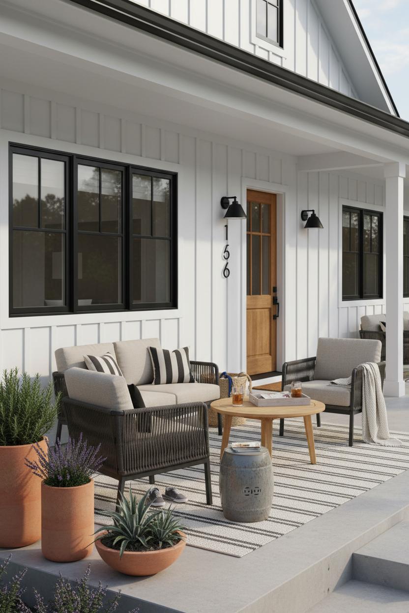 Color and contrast seal the deal. A moody charcoal or espresso trim on fascia, garage doors, and window frames frames that light siding beautifully and reads as modern without feeling stark. Black exterior light fixtures with simple, architectural lines act like jewelry—flanking the door, along the garage, and at the patio—to punctuate sightlines and guide the eye at dusk. Oversized, modern house numbers in matte black make a quiet statement and reinforce the linear theme created by the battens. If your porch is petite, lean in: a compact porch furniture set in teak or powder-coated metal keeps things airy while still inviting conversation.