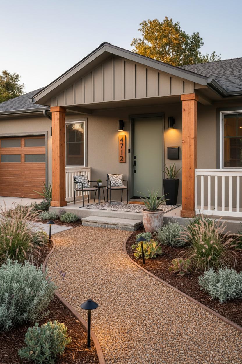 On the ground plane, think of the driveway as a giant rug leading to your front porch. Simple upgrades—scoring a grid into plain concrete, adding paver ribbons along the edges, or installing a slim steel or brick border—instantly sharpen lines and make the approach feel intentional. If you need extra parking, widen with permeable gravel or pavers so it looks designed rather than tacked on. A planting strip between the driveway and walk is a small-space hero: weave in drought tolerant plants (think rosemary, feather grass, and low agaves) that read lush with minimal fuss, and echo their shapes in a couple of chunky pots by the garage. Low, warm path lights spaced evenly down the drive complement those black exterior light fixtures and create a welcoming runway after sunset. Finally, invite people to linger: a compact porch furniture set near the entry or under a deep eave softens the long facade and visually balances the garage. When the materials, lighting, and numbers repeat across the front, your ranch house switches from “big blank wall” to a perfectly edited moment of curb appeal that feels both modern and cozy.