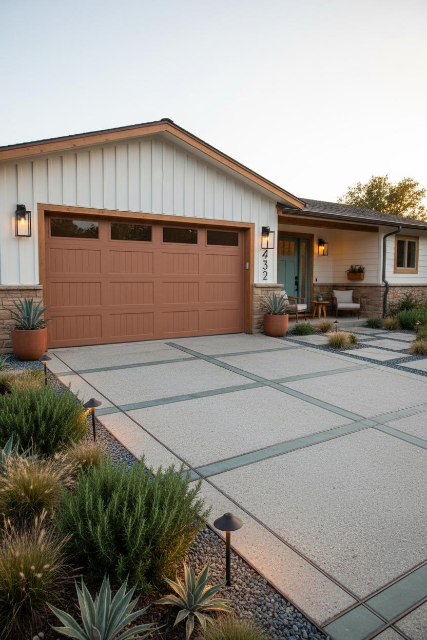 If your garage takes up a big portion of your wider ranch front, treat it like a feature wall in your living room—intentional, layered, and tied to the rest of your exterior design. Start with the garage door itself: a fresh coat in a warm, earthy tone or a sleek matte black instantly feels modern without fighting the home’s classic low profile. If you’re leaning modern farmhouse, add simple battens or swap to a carriage-style panel with clean windows for vertical rhythm. Carry that line up with a tidy band of board and batten siding on the gable or above the door to break up the width of a typical ranch house and draw the eye upward. Flank the door with black exterior light fixtures (oversized looks great on a long facade), and echo that dark hardware with modern house numbers near the entry for a crisp, readable moment that quietly elevates curb appeal. Keep the palette cohesive: repeat one wood tone on the garage trim, mailbox, and a planter box, then pull your front door color from a flower pot or the veining in your driveway aggregate so the whole ranch remodel feels curated, not pieced together.