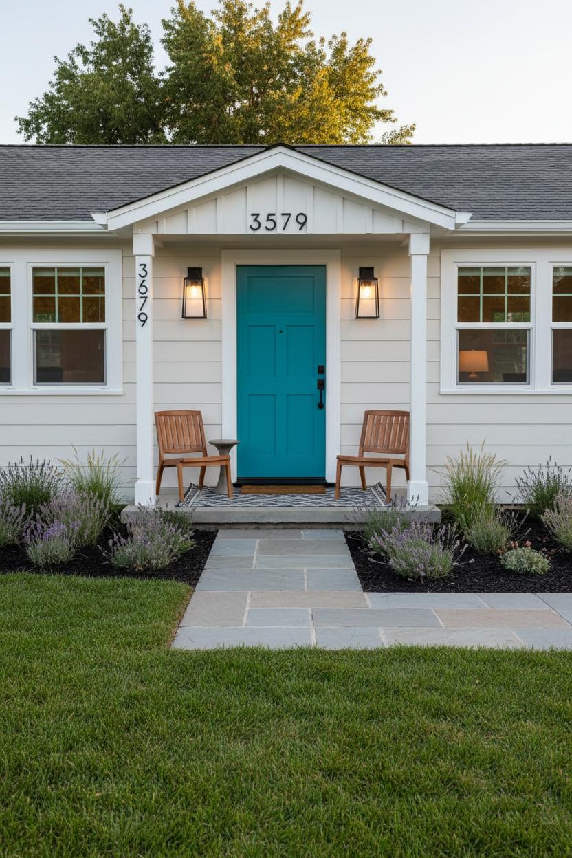 On the porch, think comfort plus character. Even a compact stoop can feel generous with a scaled-down porch furniture set—two chairs and a tiny table layered over a durable outdoor rug—so the entry reads as a place to linger, not just pass through. Swap builder lights for sleek black exterior light fixtures that bracket the door like jewelry, and repeat the finish on a new handle set and mailbox. A couple of tall planters with drought tolerant plants—olive, rosemary, or a dwarf agave—add height around a low railing without blocking sightlines. If your ranch house has skinny posts, box them out into chunky, square columns or wrap them in cedar to echo board and batten siding nearby; that subtle architecture shift delivers big style points. And don’t forget the personality shot: a painted front door in muted eucalyptus, inky navy, or tomato red sets the tone for the whole exterior design.