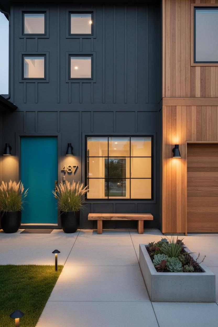 Finish the story with details that echo your palette so the styling feels intentional from driveway to door. Matte black exterior wall lights, modern house numbers, and streamlined front door hardware tie into charcoal trim; warm bronze fixtures cozy up to sandy stucco and honeyed timber. For nighttime curb appeal, layer low-glow landscape pathway lights that wash across hardscape and plantings in the same metal finish as your sconces. A front door color can be the one “pop”—inky blue, muted olive, or sun-baked terracotta—pulled from your landscaping or roof tone. When materials, color, and lighting are speaking the same language, your modern elevation feels serene, tailored, and unmistakably fresh.