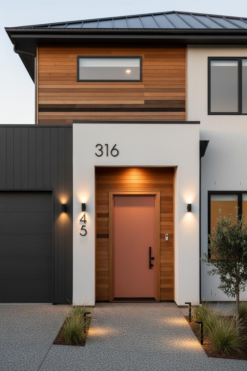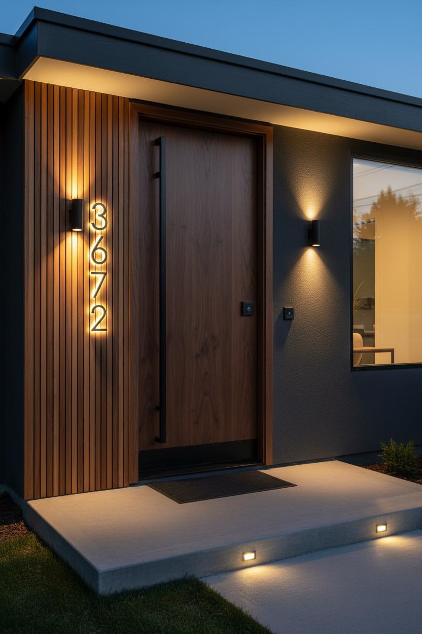 Now give visitors (and delivery drivers) an easy bullseye with modern house numbers that actually stand out. Oversized numerals with floating standoffs cast subtle shadows by day, while backlit options glow like art after sunset; both look incredible against wood slat cladding or a slim metal plaque. Think contrast: black numbers on a pale render, brushed stainless on charcoal siding, or brass on a dark-stained entry—whatever punctuates your front facade design. Mount them where they’re legible from the street, then graze the surface with exterior wall lights or guide the eye from sidewalk to stoop using low landscape pathway lights; that layered lighting not only shows off the numbers and front door hardware, it adds depth to the overall house elevation. Keep finishes in the same family for harmony, or mix two complementary tones for a collected, Pinterest-worthy look. The result is a welcoming entry that feels curated and contemporary, proof that when you fine-tune these small details, your curb appeal skyrockets without a full remodel—just smart, modern elevation moves right where they matter most.