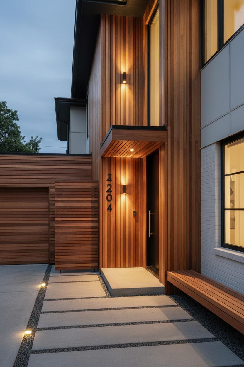 To make it sing, decide where the wood slat cladding does the most work. Framing the entry, wrapping a corner, or banding the garage can create a cohesive house elevation with just the right amount of detail. A slatted screen near the porch offers privacy while letting light through; a slatted soffit or canopy draws the eye to the front door. Cedar, thermally modified ash, or other durable species age gracefully—sealed for a richer tone or left to weather into a silvery patina that still brings depth. Then layer in the jewelry: exterior wall lights that graze the slats to enhance the texture at dusk; modern house numbers in matte black or brass for a crisp contrast; front door hardware with a streamlined profile that echoes the linear motif; and landscape pathway lights that continue the lines into the garden and guide guests to the entry. Even a slim planter or bench in a similar wood tone can bridge the architecture and the landscaping for extra curb appeal. What you get is a thoughtful composition—materials, light, and proportion working together—so your front facade doesn’t just face the street, it speaks to it. Whether you’re refreshing a compact bungalow or refining a new build, wood slat cladding is a versatile, budget-smart move that delivers modern elevation character and a warm welcome from the sidewalk to the threshold.