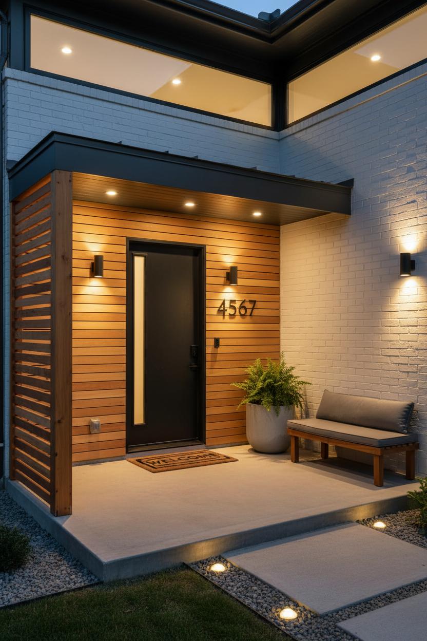 The magic is in the details you layer underneath. Exterior wall lights wash the cladding and make the entry glow at dusk; landscape pathway lights stitch the route from sidewalk to stoop with low, twinkly safety. Swap in modern house numbers sized to read from the street and coordinate them with upgraded front door hardware—think a matte black lever with a smart deadbolt, or unlacquered brass that picks up warm wood tones. Keep a simple materials palette that repeats—metal canopy, matching fixtures, and a note of wood slat cladding—to make small elements feel intentional, not busy. Even compact porches benefit from a slim bench, a planter tucked under the overhang, and a doormat that fills the landing. These are front facade design moves that punch up curb appeal without a full remodel: thoughtful shade, a defined threshold, and lighting that beckons. The result is a home that looks composed from the street and lives better at the door.