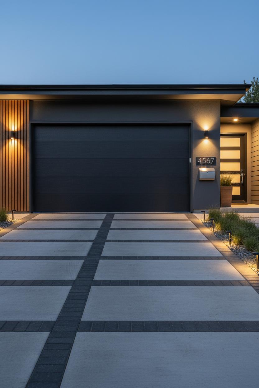 Don’t forget the driveway—it’s basically a runway for curb appeal. Edge a plain concrete drive with bricks or pavers to create a custom border, or score the slab into large rectangles for a chic, architectural grid that feels right at home with modern elevation details. If water pooling or heat is an issue, consider permeable pavers with gravel infill for sustainability points and a beautiful texture shift. Guide the approach with low, warm landscape pathway lights placed in a staggered rhythm; they make arrivals feel special and highlight planting without glare. Layer in soft grasses, groundcovers, or a slim strip of river rock along the drive to blur the transition from hardscape to landscape. Keep bins, tools, and sports gear out of sight with a tidy side-yard zone so the view stays serene. The goal is coherence: repeat a wood tone from the garage accent in a planter by the entry, pick up your exterior wall lights’ finish in the mailbox, and coordinate your modern house numbers with the trim color. Small, consistent moves turn the garage-and-drive pair into a polished welcome sequence—and that’s the kind of curb appeal that makes the whole home feel elevated.