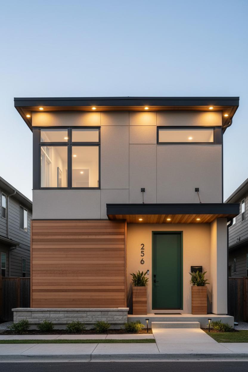 Finish with lighting and small-but-mighty details that photograph beautifully. Exterior wall lights that wash the siding, landscape pathway lights that trace the walk, and a glow at the soffits outline the architecture after dusk. Swap in modern house numbers scaled to your entry, choose front door hardware with simple geometry, and align your mailbox and doorbell so they look intentional, not accidental. Frame the doorway with planters that match your cladding tones, and keep sightlines clean—hide bins, route cables neatly, and let the address and lighting be the jewelry. Thoughtful layers like these elevate even modest footprints, proving that with smart proportions, edited lines, and tactile materials, a modern elevation can turn any home’s front facade design into a welcoming moment.