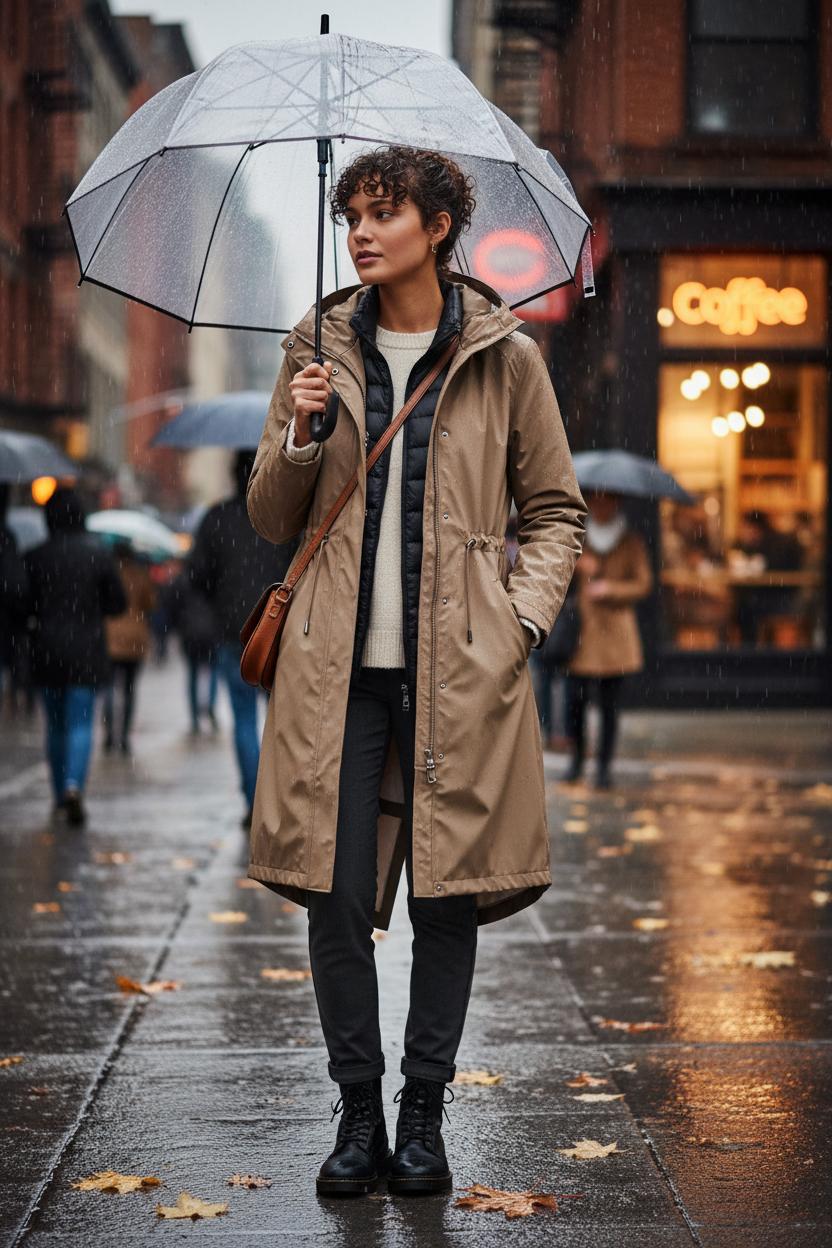 When the forecast flips from “maybe a drizzle” to “oh, it’s a downpour,” nothing earns its hanger like a waterproof parka. It’s the unsung hero of outerwear jackets because it marries real-deal function with an easy, throw-it-on silhouette that looks cool with everything. Think a matte, rain-shedding shell, sealed seams, a generous hood that actually covers your blowout, and pockets big enough for gloves and a phone. The right cut skims the body without feeling bulky, so you can layer a knit, a hoodie, or even a lightweight quilted jacket underneath when the temperature sneaks toward winter coats territory. For fall jackets season, a cinched waist and fishtail hem feel streetwise without trying too hard, and the color palette—inky navy, olive, or sandy taupe—slots right into your neutrals. It’s made for streetwear layers and casual coffee runs, but just as happy over a turtleneck and trousers for a rain-on-date-night situation. Think of it as the backbone of layering outfits: the piece that keeps you dry so the rest of your look can do the talking.
