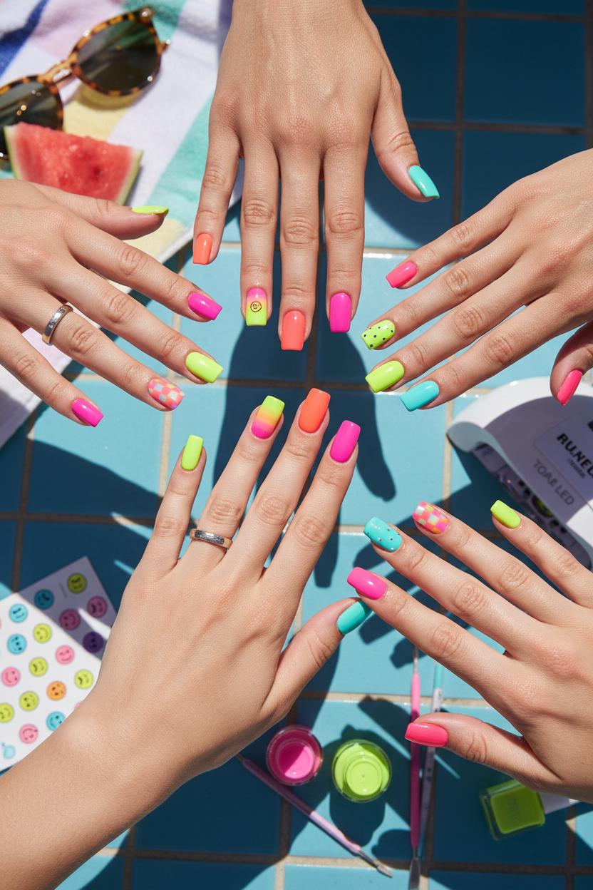 When it comes to details, tools make everything easier. Use nail art dotting tools to create confetti polka dots, micro-hearts, or bubbly smile lines, then finish with tiny accents—smiley nail stickers are the fastest way to add that cheeky mood-boosting face. If you’re short on time, press on nails cute in neon palettes give you salon-level color in minutes; add a swipe of top coat to seal and they’ll look custom. Working with gel? A quick flash under a UV LED nail lamp keeps lines crisp and color saturated, so your swirls don’t bleed and your dots stay perfect. For cute nail designs that feel effortless, try two-tone French tips, diagonal color blocks, or a single accent nail with neon checkerboard; these are easy nail ideas that still feel fresh. Mix and match brights the way you’d style sunny accessories—unexpected combos always win. However you spin it, neon is the shortcut to playful manicure magic: bright, happy, and totally ready for sunshine selfies.