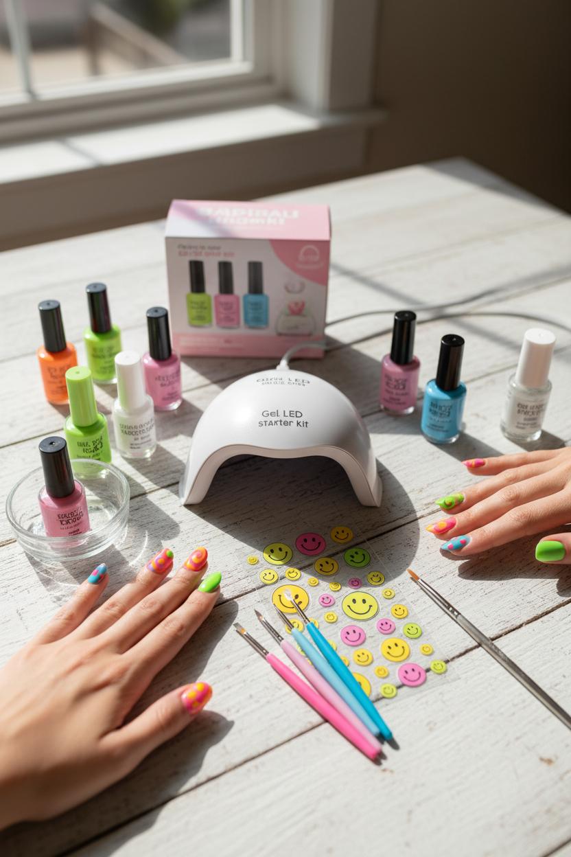 Before the dots, swirls, and cheeky little smiles, a playful manicure starts with simple prep that makes everything last. Wash your hands, gently push back cuticles, then shape and lightly buff to smooth ridges. Swipe nails with alcohol or a nail dehydrator so your base grips like a dream. A thin, even base coat is your best friend—float it on and cap the free edge, then cure under your UV LED nail lamp. If you’re sun-care savvy, a dab of sunscreen on your hands (or fingerless UV gloves) keeps skin happy while you cure. For color, gel nail polish neon sets are summer’s secret sauce: think citrus orange, lime pop, and pool-toy turquoise. Work in thin layers and cure between each coat so your canvas stays glossy and chip-resistant.