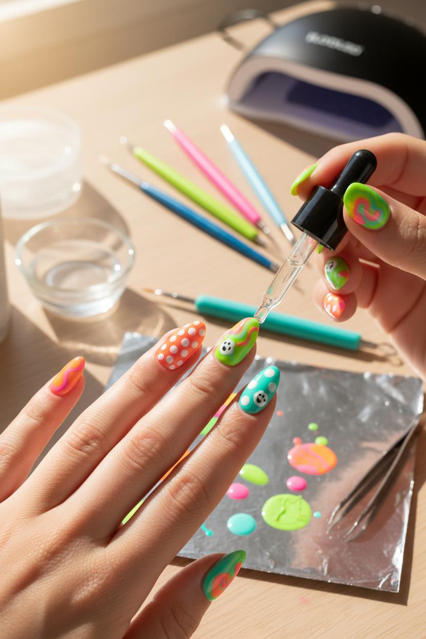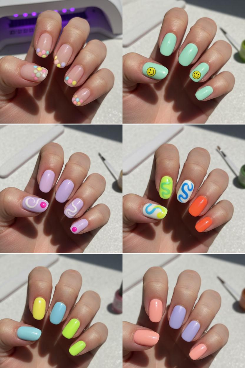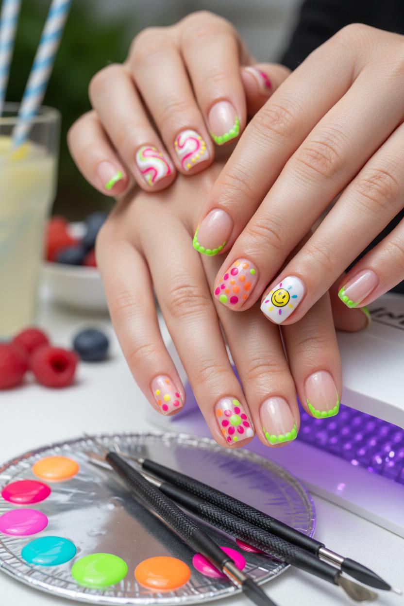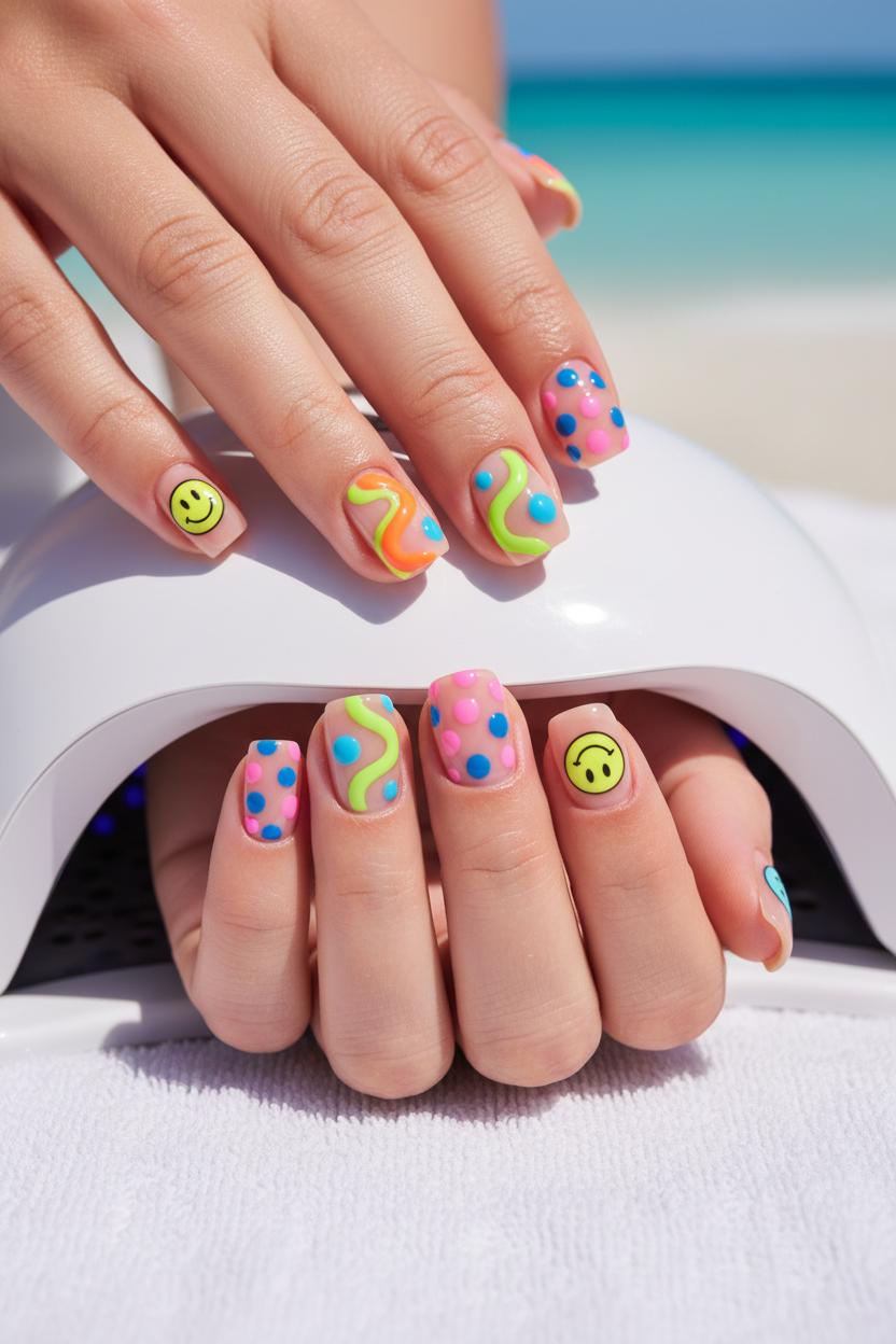 Swirls feel advanced, but here’s a beginner hack: use two complementary shades and a tiny liner brush (or the smallest of your nail art dotting tools) to draw lazy S-shapes on just one or two nails, leaving the rest solid. It’s the perfect balance of summer nail art and minimal effort. Mix and match textures too—one coat jelly, one coat cream—so your cute nail designs look layered without extra steps. If patience isn’t your thing, keep everything to single coats of color and a glossy top, curing quickly under your UV LED nail lamp for chip-resistant shine. A “skittle” palette (each nail a different hue) reads playful yet polished, especially with a neon accent tossed in. Finish by framing cuticles with a drop of oil and snap your photo while the colors still look juicy. Whether you go for dots, subtle swirls, or sticker smiles, these five-minute moves keep your playful manicure on-theme for sunny days and balmy nights—proof that the best summer nail art doesn’t have to be complicated to feel joyful.